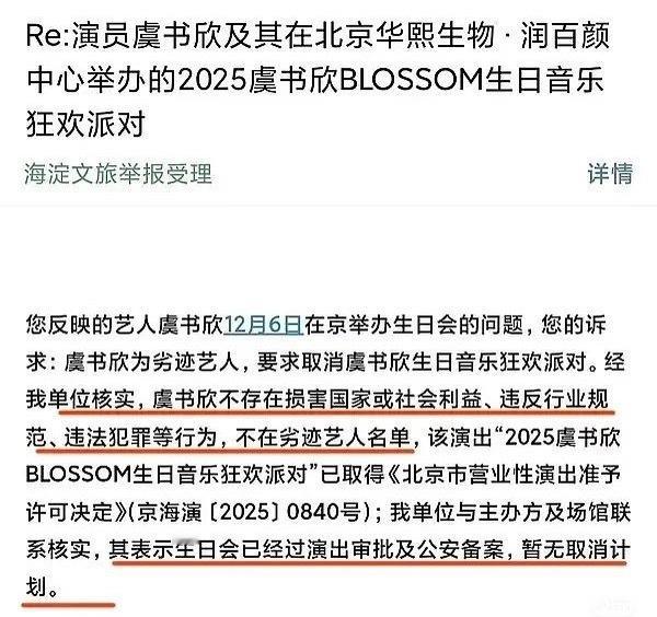 关于近期虞书欣的相关争议,官方已给出明确说法。此前,有网友就虞书欣是否为“劣迹艺人”向相关部门发邮件举报,并呼吁取消其北京生日会演出。对此,北京市海淀区文旅局在回复中表示,经核查,虞书欣不存在违规违法行为,未列入劣迹艺人名单,其生日会演出已获正式批准与备案,将按计划举行。与此同时,北京广播电视台官方微博也发布了虞书欣的采访内容,为其生日会进行宣传。随着官方的明确表态与主流媒体的推动,此次围绕虞书欣的舆论风波似乎已告一段落。