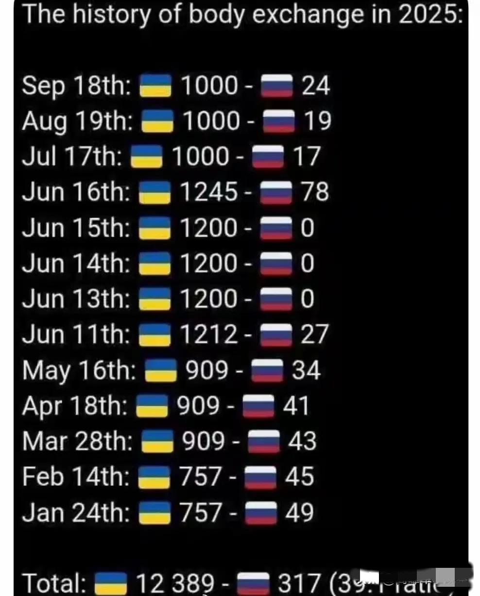 2025年1月以来,俄乌双方多次进行阵亡军人遗体交换。11月20日,俄乌再次交换,乌方从俄方接收了1000具乌军阵亡军人遗体,向俄方移交30具俄军阵亡军人遗体。 在历次的交换中,乌方接收的遗体远远高于交还的遗体。这从一个侧面反映出乌军在战场上失利,而这么高的比例,说明了乌军损失惨重。 战争拼的不仅是武器和人员,更重要的拼的是士气。乌军这么高的死亡率,会严重打击乌军的士气,降低战斗意志。怪不得乌克兰人逃避兵役,乌军逃跑的士兵那么多。因为他们不想白白的去送命。 俄乌再次交换阵亡军人遗体俄乌冲突