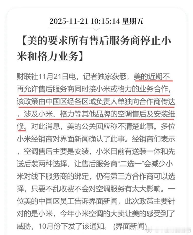 美的要求所有售后服务商停止小米和格力业务。美的近期不再允许售后服务商同时接小米或格力的业务合作,该政策由中国区经各区域负责人单独向合作商传达,涉及小米、格力等其他品牌的空调售后及安装维修。对此消息,美的公关回应称不清楚此事。多位小米经销商对界面新闻确认了此事。经销商们表示,空调售后主要是安装,小米目前有送装一体和先送后装两种选择,让售后服务商“二选一”会减少小米对线下服务商的绑定,仍有第三方合作商可以选择,只要不乱收费不会对空调服务有太大影响。一位美的中国区员工告诉界面新闻,此次政策主要针对的是小米,今年小米空调的大卖让美的感受到了威胁,10月份下发了该通知。