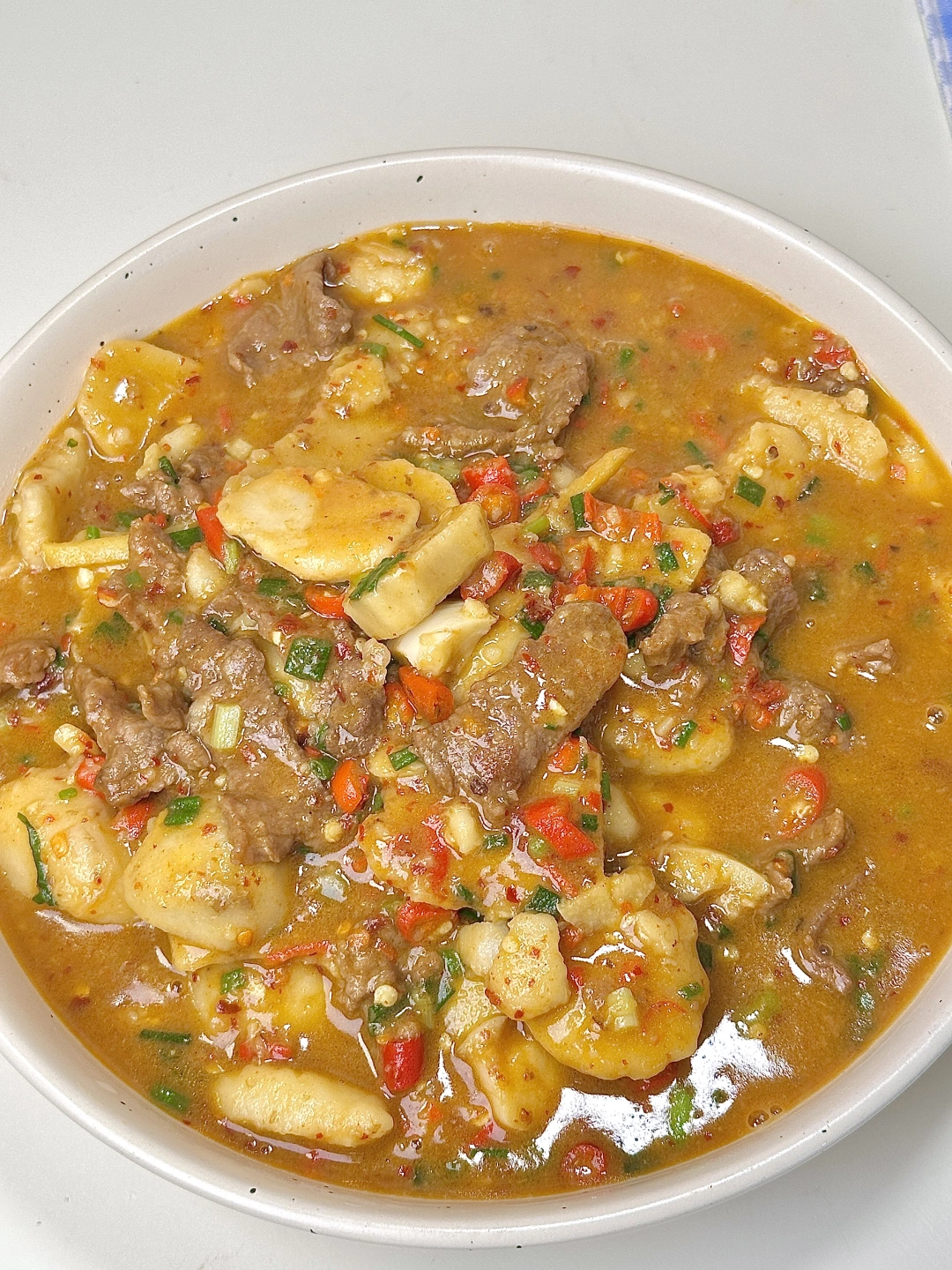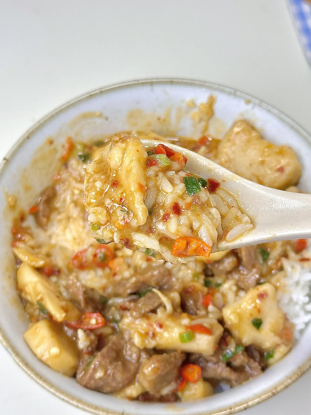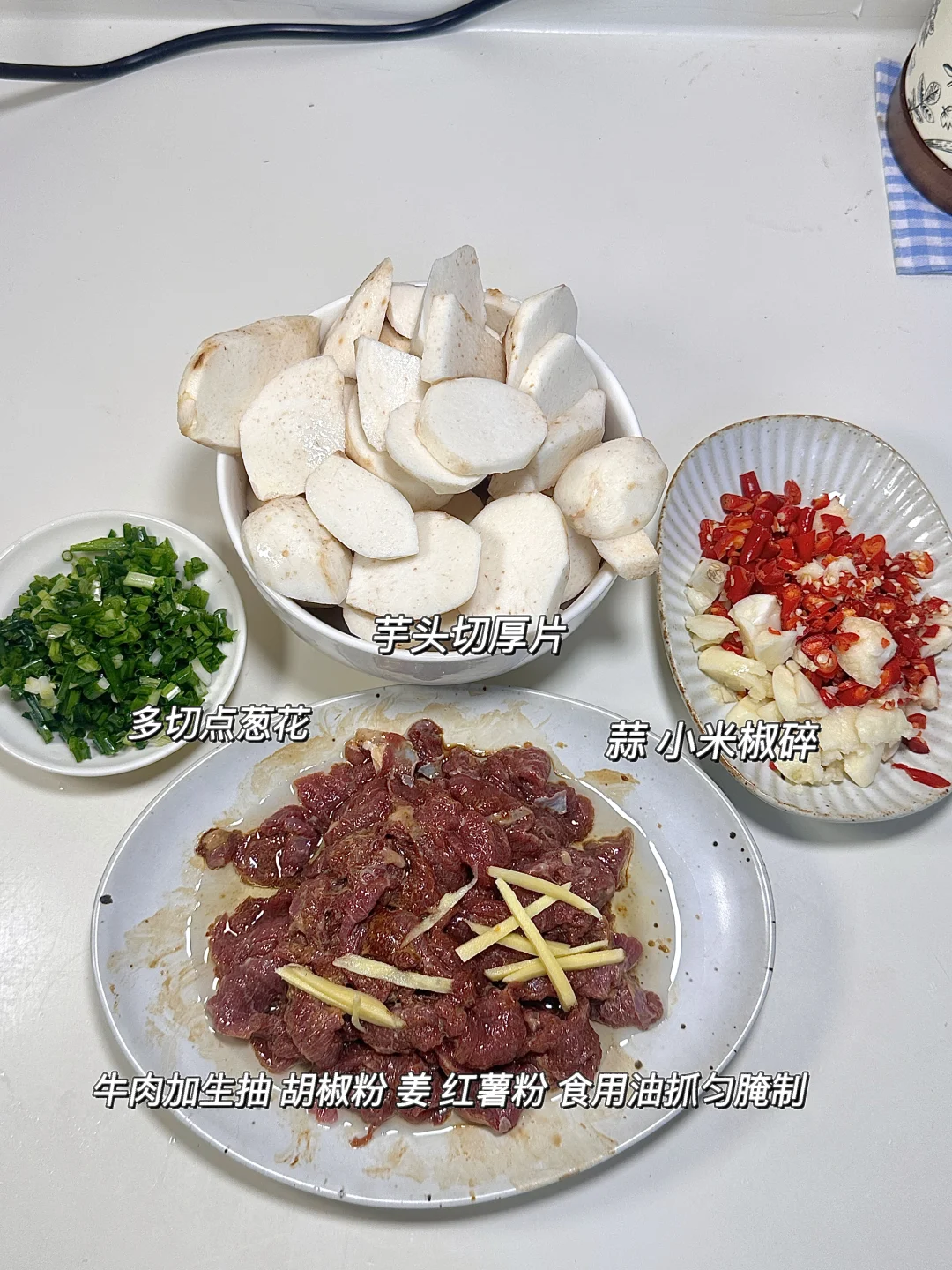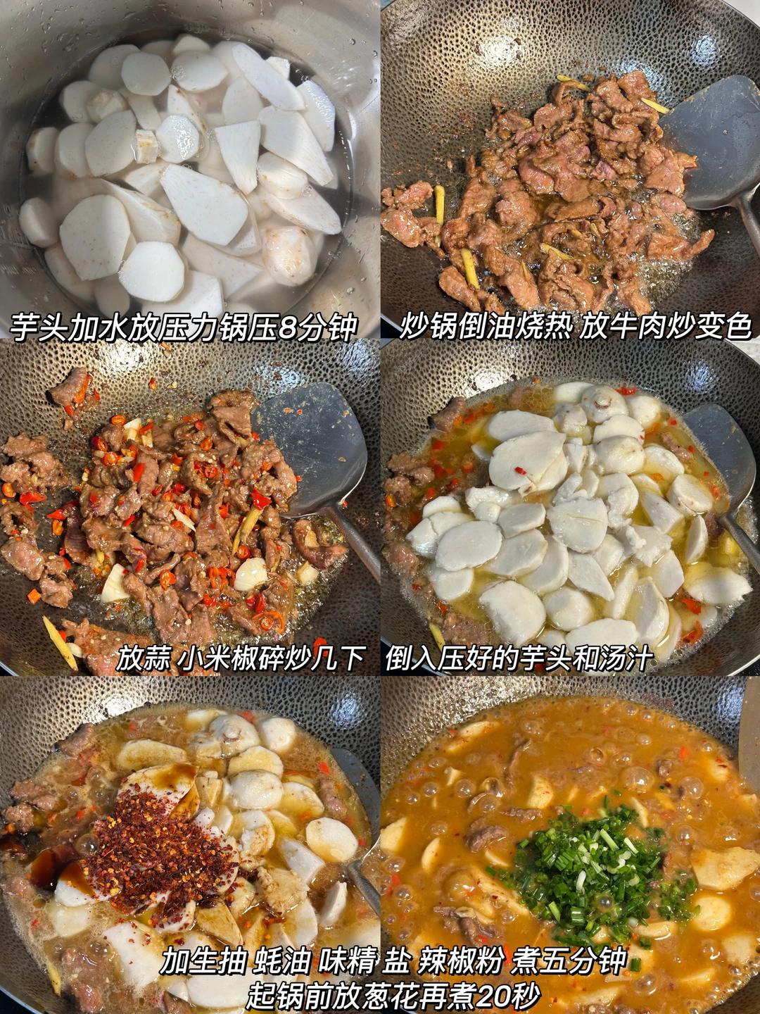 芋头烧牛肉 可以炫三碗🍚!是每个江西人都爱的一道菜吧~ ✨食材:芋头 牛肉 蒜 小米椒碎 葱花 1️⃣:芋头去皮切稍厚点的片加盖过芋头的水,放电压力锅压8分钟,高压锅5分钟。压芋头的时间备好其他食材,牛肉切片加生抽 胡椒粉,姜丝 红薯粉 食用油抓匀腌制。蒜 小米椒 葱花切碎。 2️⃣:锅里倒油放腌制好的牛肉炒变色,倒入蒜 小米椒碎炒几下,压好的芋头连着汤一起倒入锅里,加辣椒粉 生抽 蚝油、味精 盐 煮五分钟,起锅前放多多的葱花再煮20秒。 好好吃饭呀🖖🏻