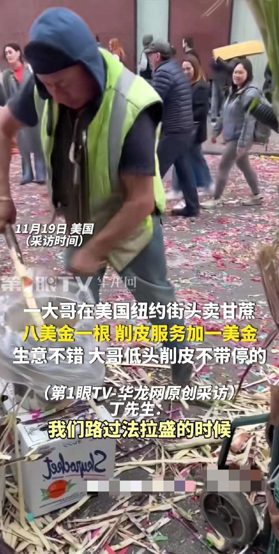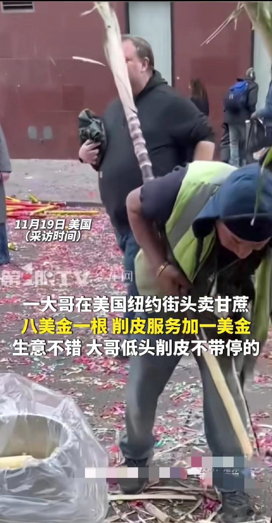 近日一大哥在美国大街卖甘蔗, 被人拍到后迅速爆火, 只见他非常专业的用镰刀削甘蔗, 周围很多人都围了上来, 美国人可能觉得比较好玩, 八美金一根 削皮服务多加一美元, 生意还不错, 美国小哥削甘蔗不带停的, 周围甚至还有排队买甘蔗的, 可能美国人没有见过甘蔗, 这小哥也算是展开了新业务, 希望他告诉了美国人甘蔗不能咽, 要不然可不好吃, 之前就有人拍自己的外国老婆第一次去甘蔗,嚼之后直接咽了, 还说吃甘蔗太辣嗓子, 殊不知吃甘蔗就吃那个水, 大家对于美国小伙在大街卖甘蔗生意红火怎么看? 美国见闻 甘蔗市场 卖甘蔗大叔 甘蔗摊位 卖香蕉小哥 卖香蕉小哥