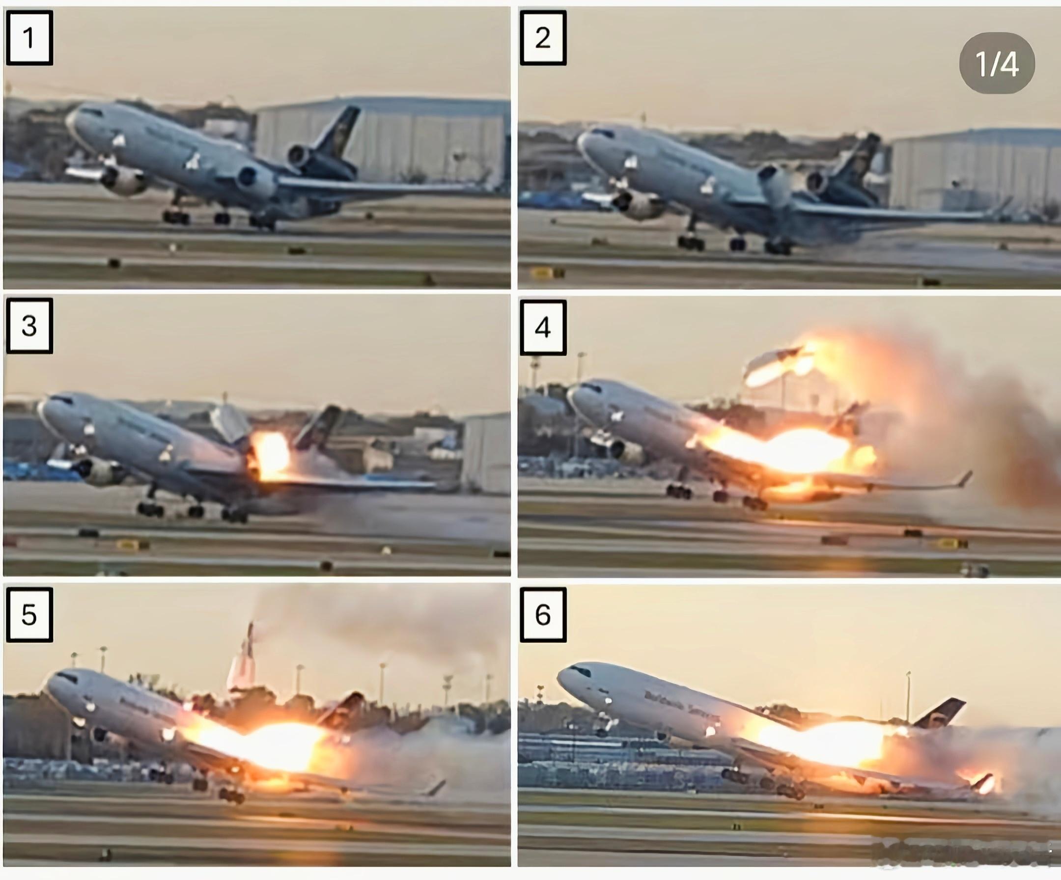 11月4日MD-11货机空难的连续照片,可见起飞过程中发动机脱落,真就191空难(DC-10发动机脱落)复刻了 ,而且刚刚离地,成功处置几率基本为零,非常绝望