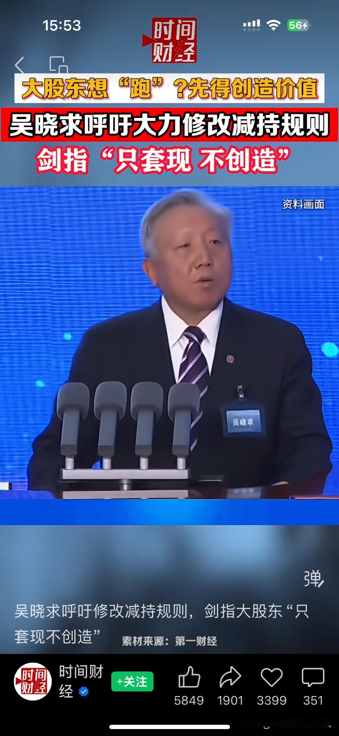 你说今天这样跌,没有大股东在减持套现吗…… 吴晓求呼吁修改减持规则,剑指大股东“只套现不创造”。大股东可以减持,但要和创造利润和社会财富相匹配。 而不仅仅是时间限定。