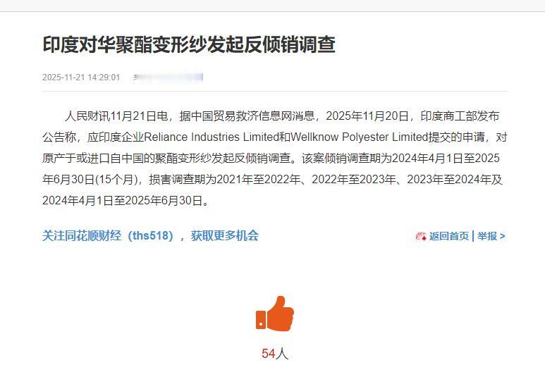 快报!快报! 印度正式宣布了 11月21日,印度商工部突然宣布对咱们中国生产的聚酯变形纱发起反倾销调查,这事儿是应印度两家大公司Reliance Industries Limited和Wellknow Polyester Limited的申请启动的,他们觉得中国的聚酯纱线卖得太便宜,伤害了印度本地的产业。 表面上看,这只是又一起普通的贸易调查,实则是印度纺织业把自家的“经营难题”当成了“中国问题”来解的典型戏码。 先得说清楚,这聚酯变形纱可不是什么冷门玩意儿,咱们身上穿的速干衣、家里铺的沙发套、甚至运动背包的面料,十有八九都离不开它,说白了就是纺织业的“基础建材”。 印度两家大公司喊着“中国货太便宜”的口号求助政府,这话听着有理,实则藏着太多经不起细扒的门道,咱们得把账算明白。 中国的聚酯变形纱能卖得“实惠”,根本不是靠什么恶意压价,而是几十年砸出来的产业链硬实力撑着的。 这东西的生产得从石化原料说起,核心原材料是PTA和乙二醇,生产一吨聚酯纤维就得消耗0.86吨PTA和0.34吨乙二醇,光PTA的成本就占了六成以上。 现在全球PTA产能92%都在亚洲,而中国又占了亚洲的大头,2024年上半年国内PTA价格稳在5700到6050元/吨,价格波动小且供应稳定。 更关键的是,中国早把从PTA炼化到纺丝、加弹的全链条打通了,头部企业光聚酯相关产能就有四百多万吨,从原料到成品一步到位,省去了中间所有倒手的成本。 对比之下印度就尴尬了,他们的PTA产能不足,大量依赖进口,光关税和运输费就比中国本土生产多了一大截,成本自然下不来。 打个比方,中国是从自家菜园摘菜直接下锅,印度则是从国外买菜还要付代购费,最后反而嫌中国菜卖得便宜,这道理根本说不通。 印度纺织业喊“受伤”,更像是在找外部替罪羊,他们自己的产业早就是一身毛病。 作为世界第三大纺织制造国,印度纺织业占了本国GDP的2.3%,工业生产的13%,说是支柱产业毫不为过,但这支柱早就被蛀得不太结实了。 2022年的数据最能说明问题,印度棉纱出口直接砍半,棉纺织品出口跌了23%,整个纺织服装总出口量比前一年少了18%,这可不是中国聚酯纱线能造成的冲击规模。 真正的问题出在他们自己身上:一方面是产能严重过剩,全国纺织价值链里光是纺纱和织造这些环节,产能就富余了30%,泰米尔纳德邦的中小纺纱厂在2023年7月干脆集体停产,根本开不了工;另一方面是成本居高不下,2022年印度国内棉价飙到92000卢比以上,政府不得不临时豁免棉花进口关税,但到了2023年5月,行业协会还在哭着求政府免掉11%的进口税,原材料成本压得企业喘不过气。 自家工厂开一半停一半,原材料贵得离谱,转头就说中国货抢了生意,这逻辑就像自己考试没复习考砸了,反倒怪同桌考得太好。 更有意思的是,印度纺织业的麻烦远不止国内这堆事,国际上的压力早就快把他们逼到墙角了。 他们的纺织品出口一半都靠欧盟、美国和英国,可现在欧盟那边竖起了两道大坎:一道是碳关税,虽然现在还没覆盖纺织品,但欧盟的“碳泄漏”风险清单里早把纺织品列进去了,2026年正式开征后,印度纺织品因为生产过程碳排放高,出口到欧盟就得额外掏钱买碳凭证;另一道是可持续战略,欧盟要求2030年进入欧洲市场的纺织品必须耐用、可回收,还不能有有害物质,可印度纺织业是出了名的污染大户,占了全国工业水污染的17%到20%,现在连纺织废料回收率都不足1%。 为了应对这些要求,印度企业不得不搞环保改造,比如投钱建闭环水循环系统,用数码印花减少化学品消耗,可这些改造都要花钱,偏偏很多品牌又不愿为“可持续”买单,企业夹在中间两头受气。 与此同时,越南、孟加拉国这些竞争对手还拿着欧盟的特惠关税,印度纺织品在欧洲市场连价格优势都没了,这种时候把矛头指向中国,不过是想转移矛盾罢了。 有个很现实的例子,印度南部纺织厂协会2023年公开说,很多中小企业连基本的成本控制都做不到,原材料浪费率比中国企业高15%以上,生产效率却只有中国的六成。 中国企业通过技术改进,比如用最新的加弹设备,让纱线的弹性和耐用性都提升了,次品率控制在1%以内,印度小厂的次品率却常常超过5%,这样的产品怎么和中国货竞争?更别提中国聚酯纱线不仅便宜,还能根据客户需求做差别化产品,从运动服专用的高弹纱到家纺用的耐磨纱,应有尽有,印度很多工厂还在生产标准化的普通纱线,根本满足不了现在市场的多样化需求。 现在全球纺织市场都在向高端化、可持续化转型,印度与其把精力花在发起调查上,不如学学中国企业,在产业链升级和技术创新上多下功夫,这才是真正能让产业活起来的办法。