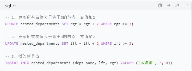 MySQL 部门架构查询实战:递归 CTE 和嵌套集合模型深度对比 MySQL 部门架构查询的两大神器,递归 CTE 和嵌套集合模型 MySQL 中处理复杂层级关系的最佳实践,闭包表和嵌套集合 MySQL 部门架构查询实战:从入门到精通 别再为部门架构查询发愁了!MySQL 这几种方法帮你轻松搞定 咱们今天来聊聊 MySQL 里特别实用的部门架构查询。很多小伙伴在开发公司管理系统、组织架构图或者电商分类目录的时候,都会遇到需要处理层级关系的数据。这时候,怎么高效地在 MySQL 里实现部门架构的查询和管理,就成了一个绕不开的问题。 两种主流方案大比拼 在 MySQL 里处理部门架构,目前有两种主流方案:递归 CTE(公共表表达式)和嵌套集合模型(Nested Set Model)。这两种方案各有优缺点,适用的场景也不一样。 先来看个对比表格,让大家有个直观的认识: 递归 CTE:简单直接的层级查询 递归 CTE 是 MySQL 8.0 引入的一个强大功能,它可以让我们用一种简洁的方式处理层级数据。咱们先来看个简单的部门表结构: 然后插入一些示例数据: 现在,如果我们想查询技术部下面的所有子部门,就可以用递归 CTE 来实现: 这个查询分为两部分: 第一部分是初始查询,找到技术部这个根节点; 第二部分是递归查询,不断查找子节点,直到没有子节点为止。查询结果会包含技术部及其所有下级部门,还会显示每个部门的层级深度。 不过,递归 CTE 也有一些问题需要注意。 比如,当部门层级很深的时候,查询性能会变得很差,因为每次递归都要执行一次子查询。 另外,如果部门表数据量很大,递归查询可能会占用大量内存,甚至导致服务器崩溃。 嵌套集合模型:高效查询的秘密武器 嵌套集合模型是另一种处理层级数据的方法,它的核心思想是为每个节点分配左右值,通过左右值的范围来确定节点之间的层级关系。 先来看表结构: 插入示例数据: 在嵌套集合模型中,每个节点的左值和右值之间包含了其所有子节点的左右值。 比如,技术部的左值是 2,右值是 9,那么所有左值大于 2 且右值小于 9 的节点都是技术部的子节点。 查询技术部下面的所有子部门就变得非常简单 这种查询方式只需要一次表扫描,无论层级有多深,查询效率都非常高。 但是,嵌套集合模型也有自己的问题。最大的问题就是插入和更新操作非常复杂,因为每次插入或删除节点都需要更新相关节点的左右值。 比如,要在技术部下面添加一个新的运维组,就需要这样操作 可以看到,插入一个新节点需要三次更新操作,而且如果部门树很大,这些更新操作会影响很多记录,性能开销非常大。 实际应用中的优化方案 在实际开发中,我们该如何选择和优化这两种方案呢?这里给大家分享一些经验。 递归 CTE 优化 对于递归 CTE,我们可以通过以下几种方式来优化: 添加适当的索引:在 parent_id 字段上添加索引,可以加快递归查询的速度。 限制递归深度:如果不需要查询所有层级,可以通过 LIMIT 子句限制递归深度。 缓存常用查询结果:对于一些不经常变化的层级查询结果,可以考虑缓存起来,减少重复查询。 嵌套集合模型优化 对于嵌套集合模型,优化方案主要有: 添加复合索引:在 lft 和 rgt 字段上添加复合索引,可以加快查询速度。 批量更新:如果需要进行多次插入或删除操作,可以考虑批量更新,减少数据库事务的开销。 定期重构树:当频繁进行插入和删除操作导致树结构变得不合理时,可以定期重构整个树,重新分配左右值。 闭包表:另一种选择 除了递归 CTE 和嵌套集合模型,还有一种叫做闭包表(Closure Table)的方案也值得一提。 闭包表的核心思想是创建一个额外的表来存储所有节点之间的层级关系。 表结构如下: 每次插入或删除节点时,需要更新闭包表。查询时直接从闭包表中获取层级关系,不需要递归或复杂的左右值计算。 闭包表的查询效率很高,插入和删除操作的性能也比嵌套集合模型好,但是需要维护额外的表,数据冗余度较高。 总结与建议 最后给大家一些实用的建议: 如果你的部门架构变化频繁,查询需求不是特别复杂,优先选择递归 CTE。 如果你的部门架构比较稳定,但是查询非常频繁,尤其是需要频繁查询某个部门的所有子部门,建议使用嵌套集合模型。 如果你的部门架构既需要频繁更新,又需要频繁查询,可以考虑使用闭包表方案。 无论选择哪种方案,都要根据实际业务场景进行性能测试,找到最适合自己的方案。 好了,今天关于 MySQL 部门架构查询的内容就讲到这里。大家如果有什么问题或者想法,欢迎在评论区留言,咱们一起讨论交流!