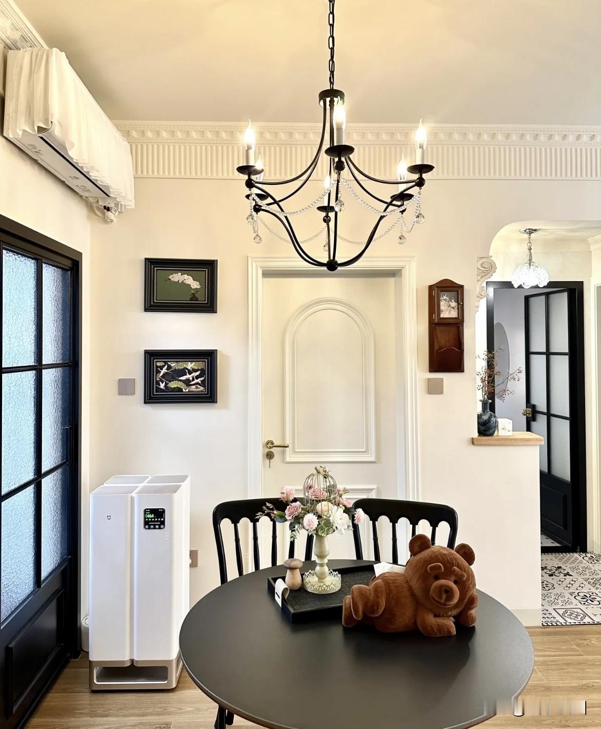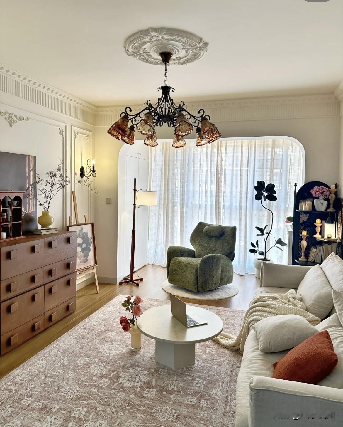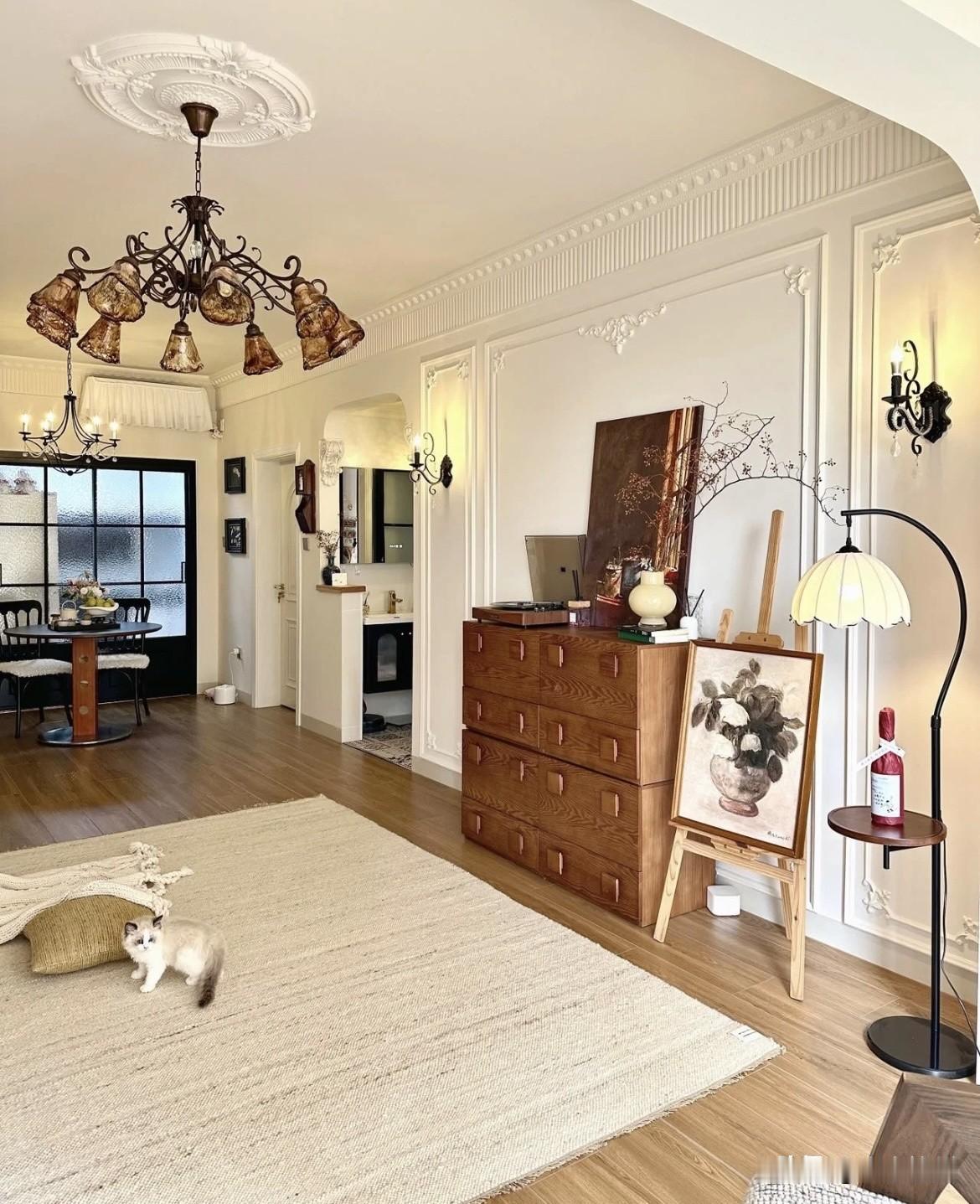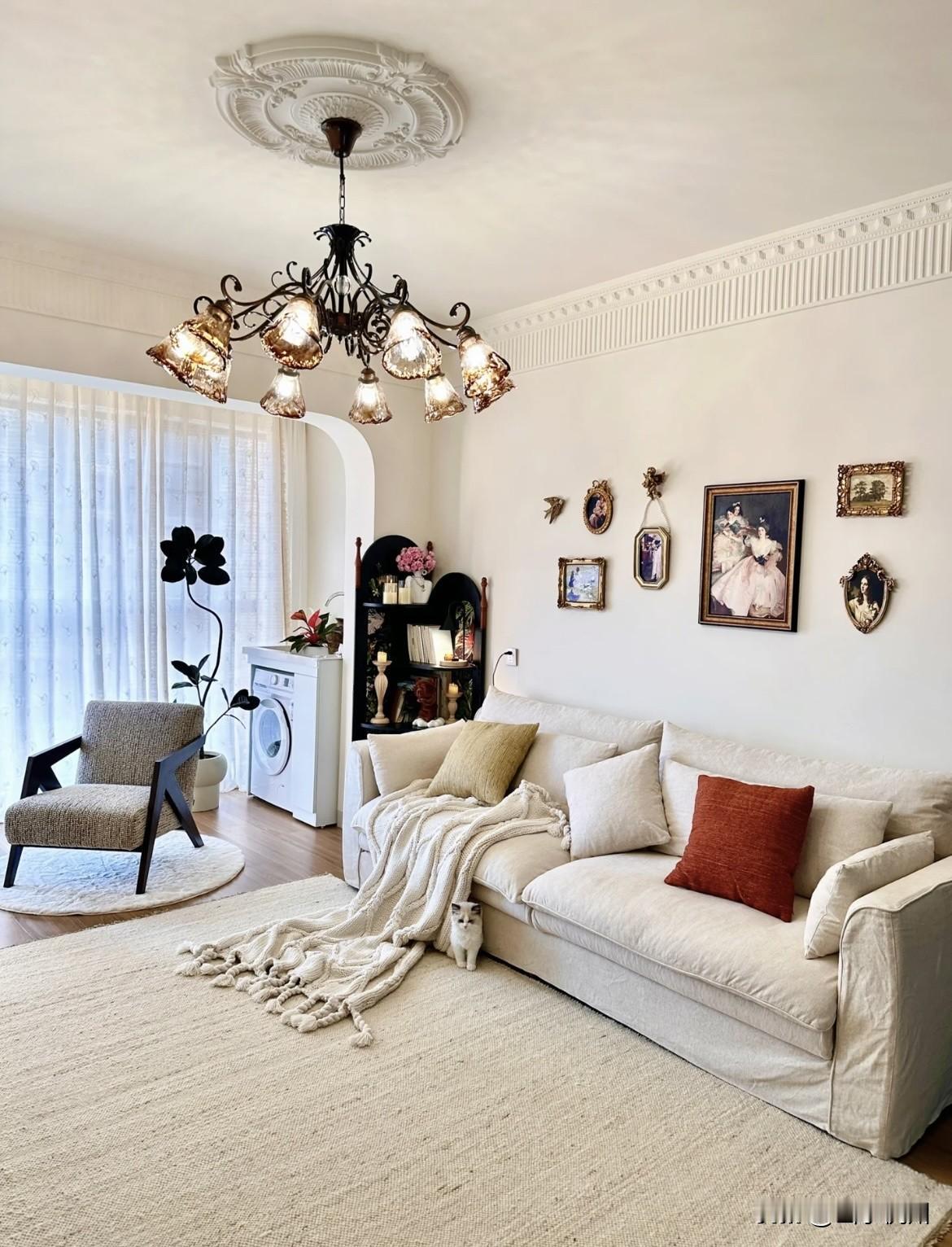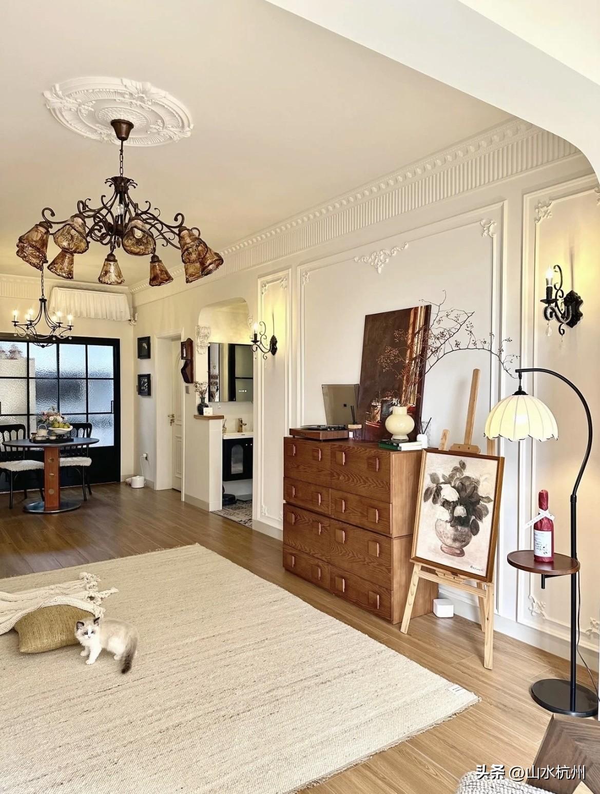 今天分享的是来自广东美女的家,建面80平,套内60,自主设计装修,硬装10W软装5w,全屋通刷可可蛋奶,没有吊顶,没有中央空调没有定制柜,随心所欲按喜好搭配。 灵活多变的自由组合的成品柜,一盏复古吊灯,颜色和谐的配色,组成了我的法式复古小家,氛围感落地灯,干净整洁的家,轻硬装 ,重软装,真的越住越安逸啦! 客厅的主色调是黑 、白棕为主,层高2.75米,开间3.6米,硬装非常简单,没有吊顶,只装了一盏复古吊灯来提升氛围,也没有多余的造型,只有一圈石膏线,浅浅的色调让空间也开阔很多,没有做太多定制柜,成品柜子满足储物需求,再搭配一个造型特别的落地灯,整个客厅就有了种自带电影滤镜的氛围。 虽然装修是随心所欲,但确实别有一番风味,对于这样的装修,大家怎么看?你喜欢这样的风格吗?
