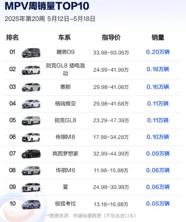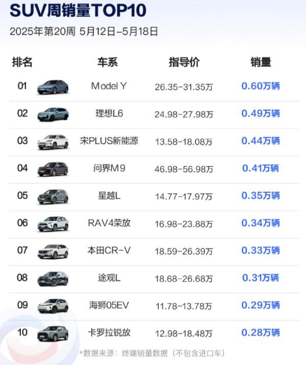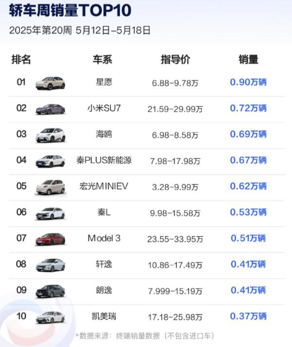 5月12日~18日各级别车型周销量TOP10发榜! 轿车周销量第1名为星愿,周销量为0.90万辆。 SUV周销量第1名为Model Y,周销量为0.60万辆。 MPV周销量第1名为腾势D9,周销量为0.20万辆。【来自懂车帝车友圈】