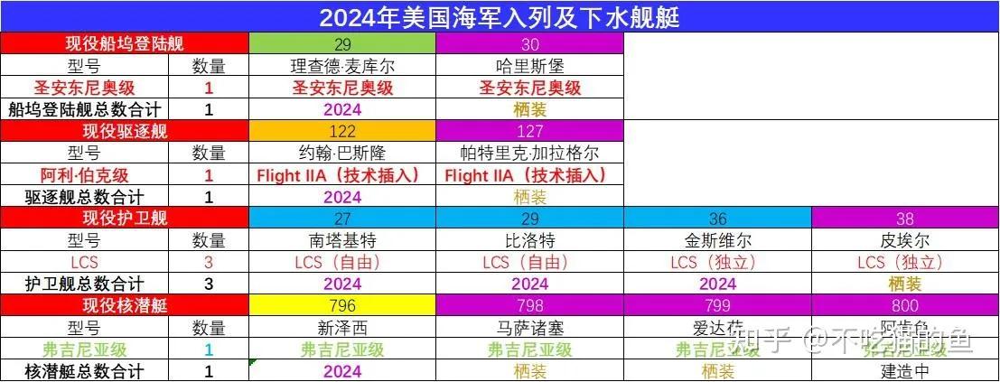 2024年美国海军新服役了1艘阿利伯克级驱逐舰、1艘圣安东尼奥级船坞登陆舰、3艘"星座"级护卫舰舰和1艘弗吉尼亚级核潜艇。 圣安东尼奥级船坞登陆舰满载排水量25000吨,阿利伯克级驱逐舰满载排水量约10000吨,"星座"级护卫舰满载排水量7500吨,弗吉尼亚级核潜艇水下排水量约10000吨,总吨位约67500吨。 2024年中国海军新服役的水面主战舰艇为3艘052DL驱逐舰,满载排水量约7500吨,总吨位为22500吨。首批两艘054B型护卫舰并没有在2024年服役,现在已经确定是在2025年服役。 在习惯了中国海军常年下饺子式服役新舰艇后,2024年新服役舰艇显得十分少!主要原因就是之前的造舰高潮结束,新的造舰高潮刚开始,新下水的舰艇还未服役。 2024年中国海军新下水了1艘076型两栖攻击舰“四川舰”、满载排水量约5万吨, 1艘055型万吨大驱、满载排水量约1.3万吨,3艘052D改进型驱逐舰,满载排水量约7500吨,4艘054A型护卫舰、满载排水量4000吨。 1艘903A型综合补给舰,满载排水量约2.3万吨,1艘常规潜艇、3艘093B攻击型核潜艇,下水舰艇总吨位超过15万吨。 新批次的055大驱、052D驱逐舰等将在最近两年陆续服役,076两栖攻击舰可能批量建造,中国海军已经迎来了新一批造舰高潮!美国海军 核动力航母 055b驱逐舰 美国核潜艇 中美海军