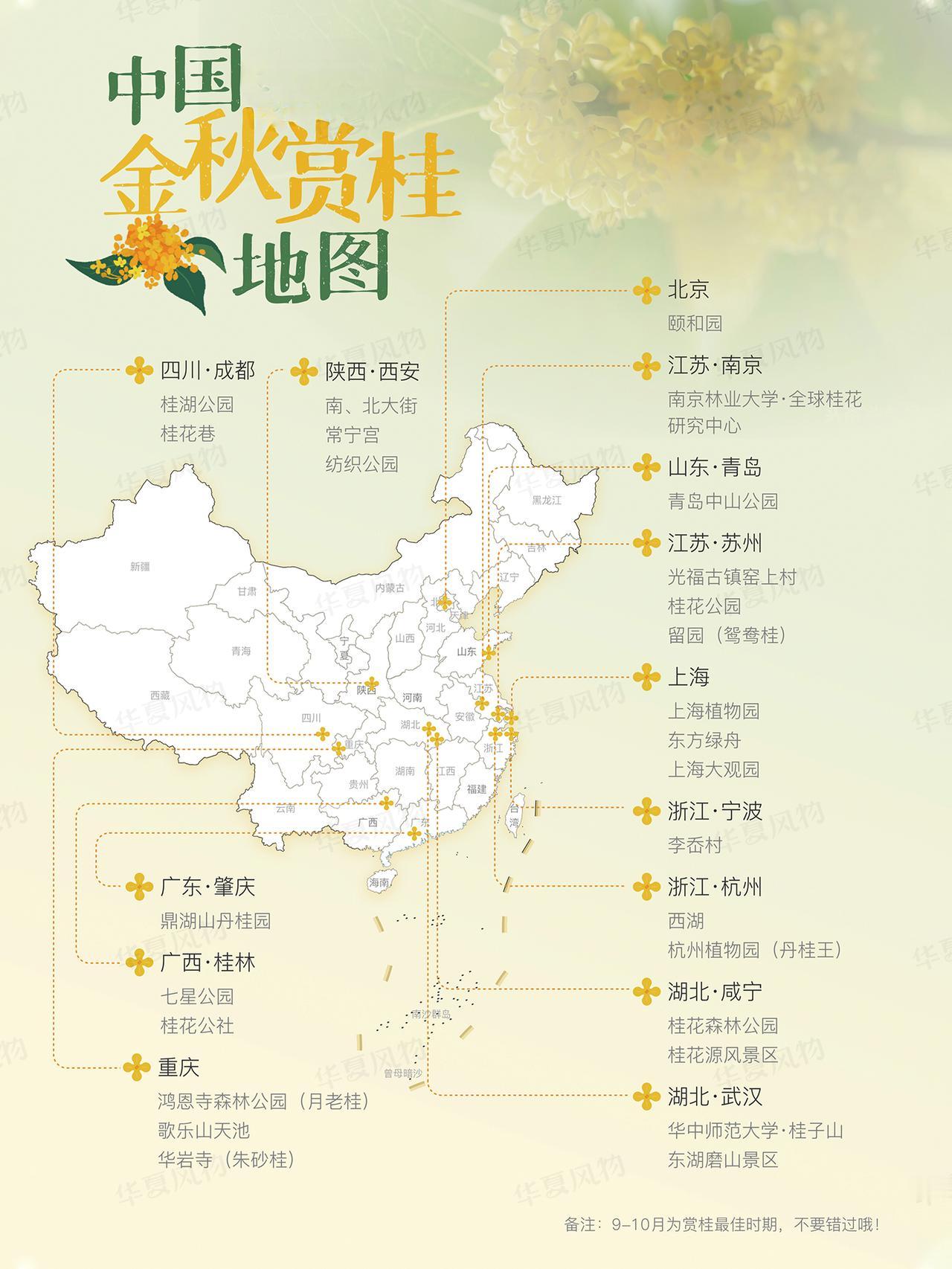 ✨全国赏桂地图|抓住香喷喷的泼天“馥桂” 当你未曾见到枝头一簇簇的桂花,却能率先嗅到空气中飘散的香气,便知已是秋容新沐的季节。一轮满月,桂影婆娑,花香盈袖,当属此时独有的良辰美景。 🔎有“桂”即“贵”? “桂”通“贵”,名字也颇有彩头。由于花开于中秋,古人还常用其赞誉秋试及第者,登科被称为“折桂”,如今仍是祝福他人仕途通达、学业有成的吉祥话。 💫 桂花之味 桂花香,因混合了顺式罗勒烯和紫罗酮等极易挥发的香味物质,清雅中又带了一丝香甜,辨识度极高。《红楼梦》中的“木樨清露”,宝玉赞之“香妙非常”,其实就是用桂花制作而成。 📌赏桂地点放送 🌟江南地区 满觉陇📍浙江·杭州 沿步道植有7000多株桂花树,步入其中,细小桂花不时被山中秋风吹得阵阵浓香,若赶上急风,金色花瓣散落遍地,便有了“满陇桂雨”。 杭州植物园📍浙江·杭州 2000余株桂花中还藏着一棵高达10余米、径围超过1米的“镇园之宝”丹桂王。 上海植物园📍上海 有超过一万株的桂花,数量之多在上海首屈一指。这里的秋季花展和东方绿舟的“绿舟赏桂”、大观园的上海旅游节,已成为金桂飘香时沪上人们十分重要的节庆活动。 光福窑上村📍江苏·苏州 苏州桂花种植最多的村落,也是全国五大桂花产区之一。 桂花公园📍江苏·苏州 姑苏城区赏桂必到之地,可以观赏到50余个品种的桂花(国内共有62个品种),丰富性居全国首位。 🌟北方地区 颐和园📍北京 皇家园林自有包罗万象的气魄,每年国庆前后,颐和园都会举办桂花文化节,展出桂花名品,堪称“北方盆栽桂花的龙头”。 中山公园📍山东·青岛 虽然北方偏碱性的土壤较难供养桂花,但早在1956年,青岛就建有属于桂花的园子。 纺织公园📍陕西·西安 西安老牌赏桂地,沿法桐林荫道漫步,穿过曲曲折折的石板路,沉浸式体验桂花清香与秋景交融的惬意。 🌟西南地区 鸿恩寺森林公园📍重庆 中国桂花品类最齐全的公园之一,园内拥有一株直径1.06米的桂花树,被称为“月老桂”,见证着爱情的生根发芽。 桂湖公园📍四川·成都 园内现存明代状元杨升庵手植古桂树群,包含金桂、银桂、丹桂、四季桂四大品种,树龄最长达500年。 🌟华南地区 七星公园📍广西·桂林 鼎湖山丹桂园📍广东·肇庆 这个秋天,别再错过限定版的桂花香了!快带上小伙伴们,去感受“叶密千层绿,花开万点黄”的浪漫吧~ 💬无奖竞猜:月桂是桂花吗?