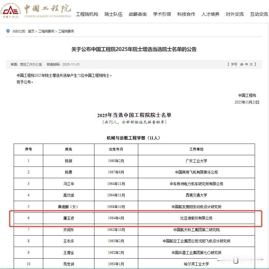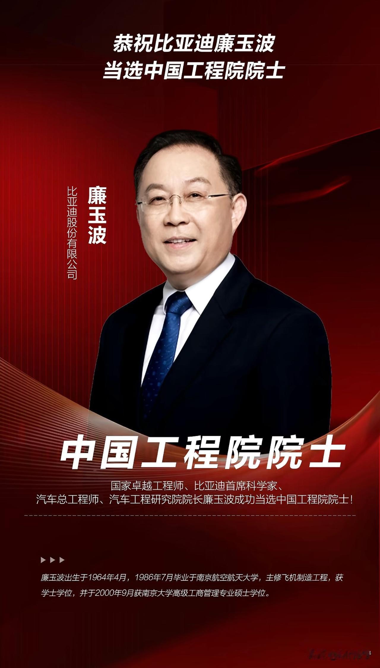 有些人的成功,不是PPT堆出来的,而是真刀真枪、一项项技术硬打出来的。廉玉波,就是这样一个典型。 当“比亚迪首席科学家廉玉波当选中国工程院院士”这一消息出来时,很多人的第一反应是:终于实至名归了。 毕竟,在如今这个“谁都能说点大话”的时代,真正靠技术立身、靠工程实战打出行业地位的人,少了。而廉玉波,是那种不在台前,却能决定行业天花板的人。从新能源动力总成,到整车研发,从刀片电池、e平台,到混动技术背后的系统工程,他几乎参与并主导了比亚迪最核心、最“压箱底”的那部分能力。别人还在卷宣传时,他在卷技术;别人等供应链时,他带团队自己造。 这次他被选为中国工程院院士,不仅是个人荣誉,更像是给中国新能源车行业打了一针强心剂:真正能改变世界的,是工程师,而不是 PPT。 外界常说,比亚迪这家公司骨子里就是“工程师文化”——今天看来,这句话不只是形容词,而是事实。廉玉波的当选,意味着中国汽车产业的技术路线、话语权和判断力,越来越掌握在真正懂技术、敢创新的人手里。 一个国家的产业竞争力,最终拼的还是原创能力;而原创能力,靠的是像廉玉波这样的工程师群体——脚踏实地、敢啃硬骨头、能把不可能变成可能。 比亚迪说“技术为王、创新为本”,很像一句口号;但一个工程师成为院士,这就是最硬的证明。 技术决定格局,工程师改变时代。 这回,中国工程院给出的答案,足够清楚。