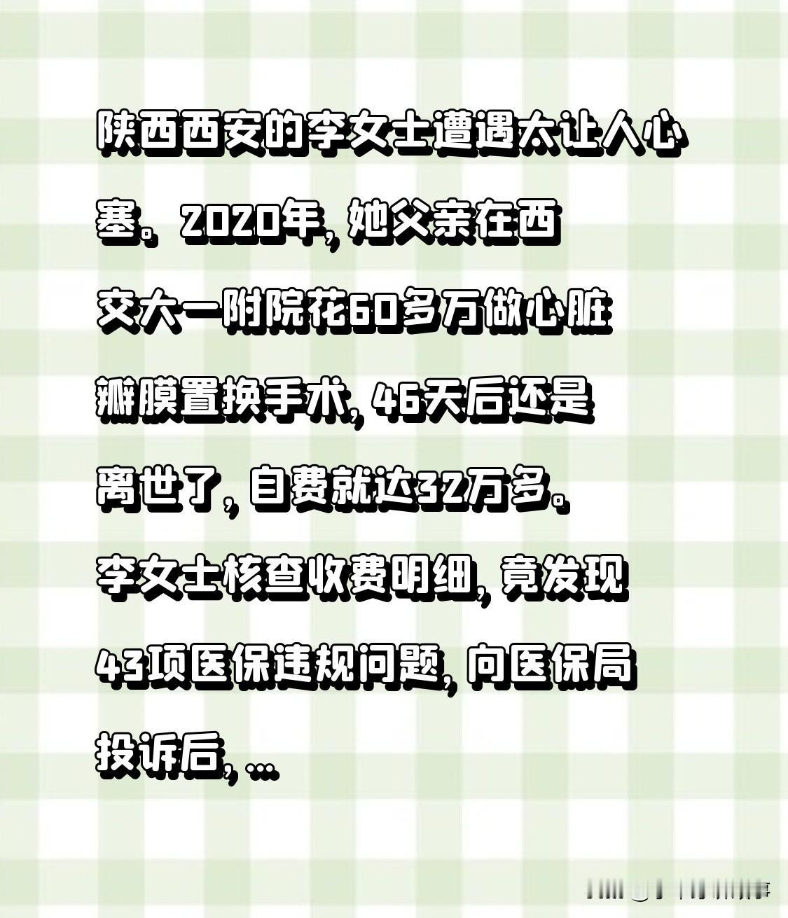 震惊!陕西西安李女士的遭遇着实令人心塞。2020年,她父亲在西交大一附院花60多万做心脏瓣膜置换手术,46天后不幸离世,自费32万多。 李女士核查收费明细,发现43项医保违规问题,向医保局投诉后,确认26项属实,涉及医保基金75060.4元。 其中问题诸多,多项耗材收费无病历佐证,治疗项目无报告单,手术知情告知书与手术记录还不一致。好在医保部门依规处理,李女士获2234.41元举报奖励。医院真该反思,别让患者花冤枉钱。
