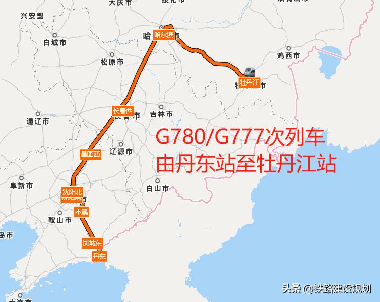 G780/G777次列车由丹东站至牡丹江站 始发车站:丹东站 终点车站:牡丹江站 发车时间:17:12 到站时间:22:43 运行时间:5小时31分 全程里程:约1073公里 列车平均速度为189km/h 列车型号:和谐号(CRH380BG型) 担当路局:哈尔滨局 途经省份:辽宁、吉林和黑龙江省等 途经线路:沈大高铁、京哈高铁沈哈段、哈牡客专等