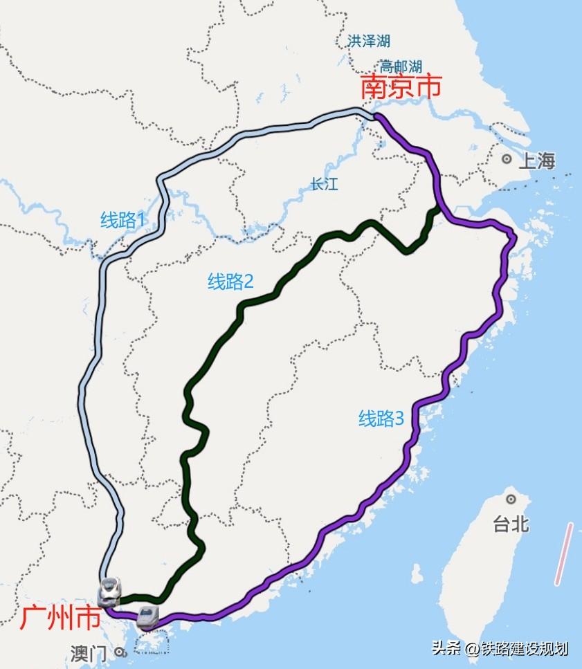 南京至广州每天有7个车次(含2趟普速列车,本文不做介绍),从剩余的7趟高铁/动车车次,两地有3种线路方案,下面我们一起来了解下: 线路1:沿宁蓉线、京广高铁等运行,途经合肥、武汉、长沙等地,代表车次有G637、G1745、G1553等车次; 线路2:沿宁杭高铁,杭昌高铁、京港高铁、甬广高铁广汕段等运行,途经杭州、南昌、赣州等地,代表车次有G3075次列车; 线路3:沿宁杭高、杭深线、广深港高铁等运行,途经杭州、宁波、福州等地,代表车次有D4107次列车。