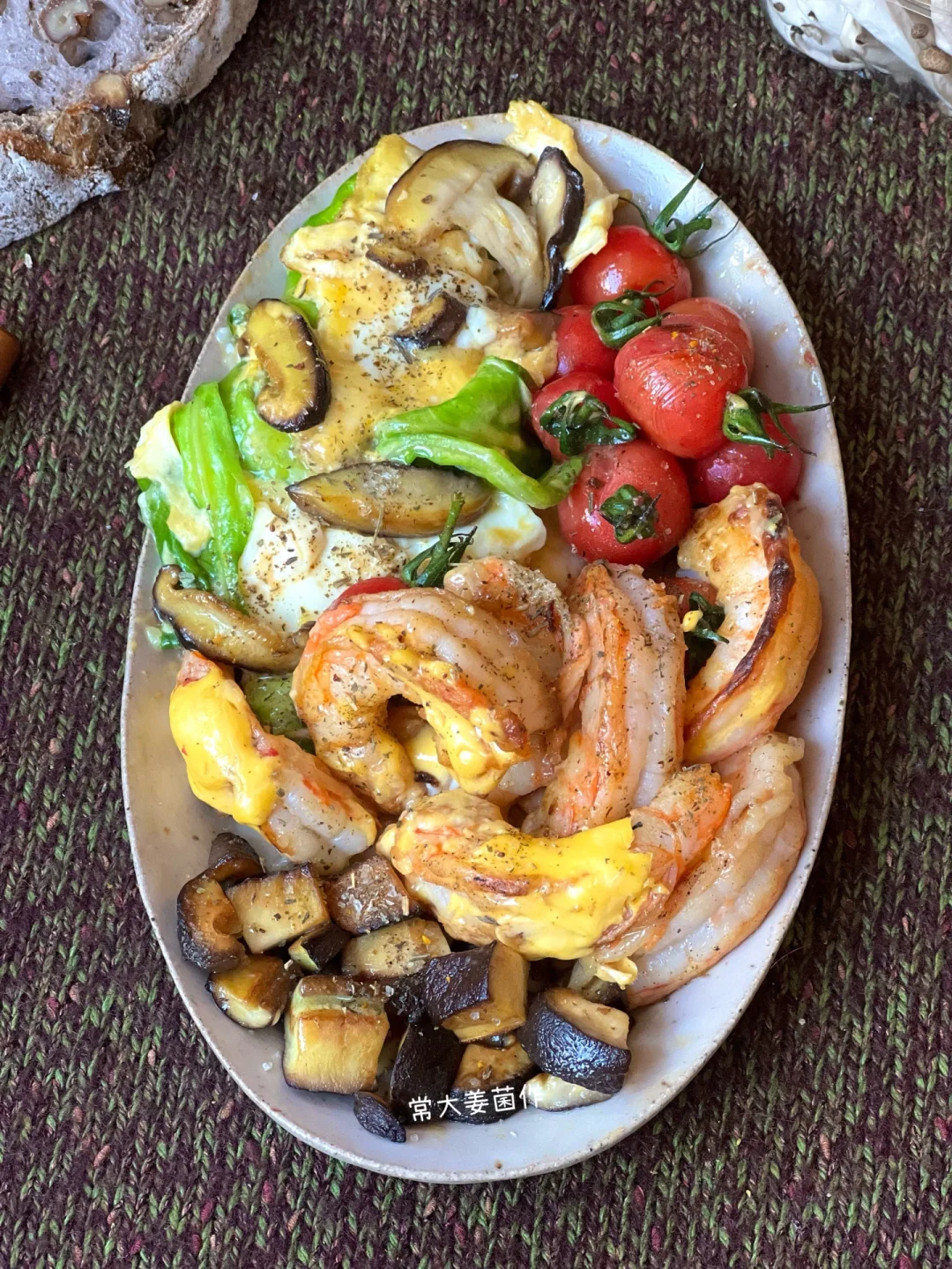 没啥食欲,又想营养全呼呼,脂肪蹭蹭掉~ 那就搞个最省事的一盘端: 蔬菜🥬、鸡蛋🥚、虾🦐、芝士🧀 煎熟, 黑胡椒盐简单调个味~