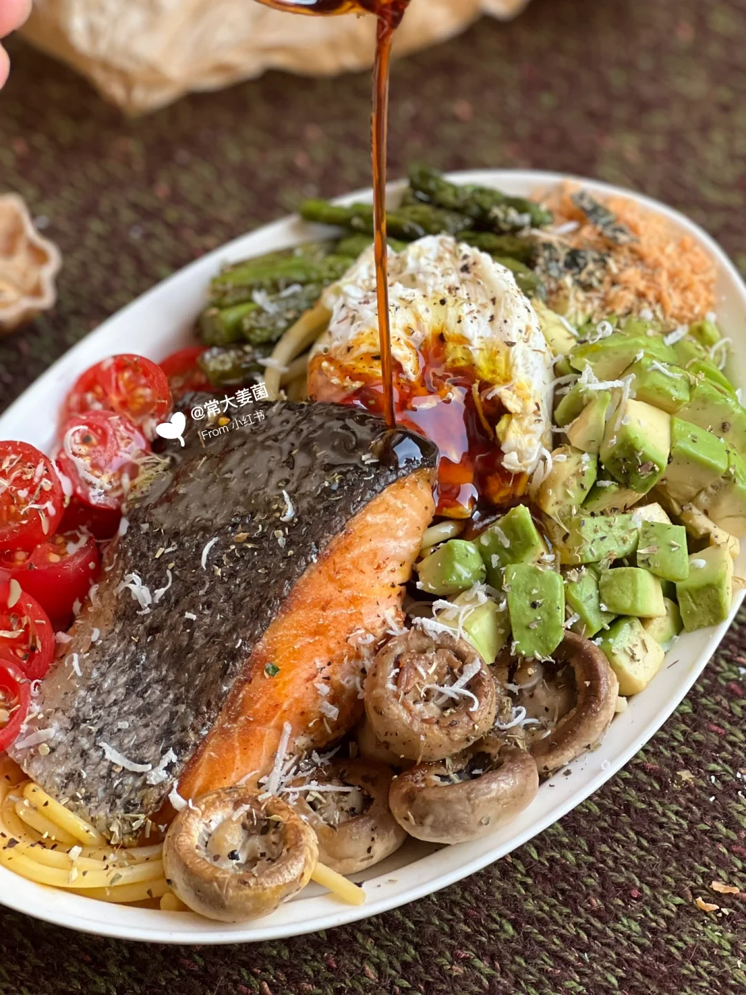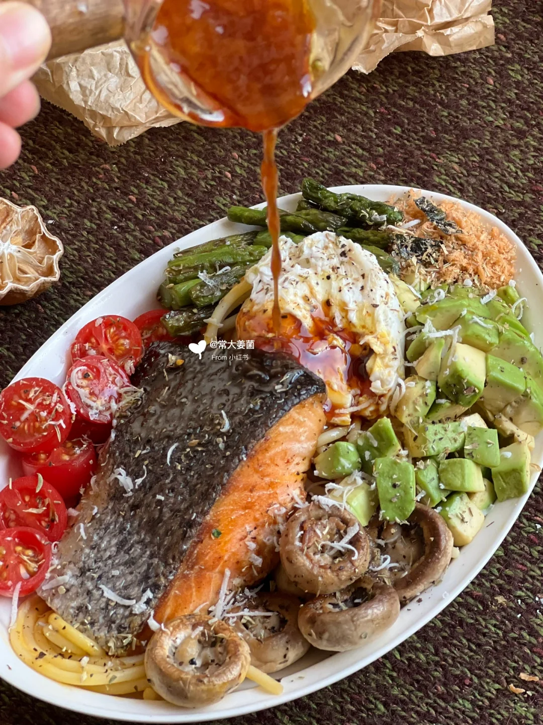 波奇碗又来喽~ ①选择自己喜欢的蔬菜、蛋白质等食材煎制做topping ②主食垫在碗下 ③精华是那一碟酱汁!✨👇🏻 蜂蜜多一点➕酱油少一点➕低卡柠檬沙拉汁(系列任何水果风味沙拉汁都可)➕麻油一丢(这酱汁是我自己实验出来的,hen符合我自己的口味!大家可以试试哇!