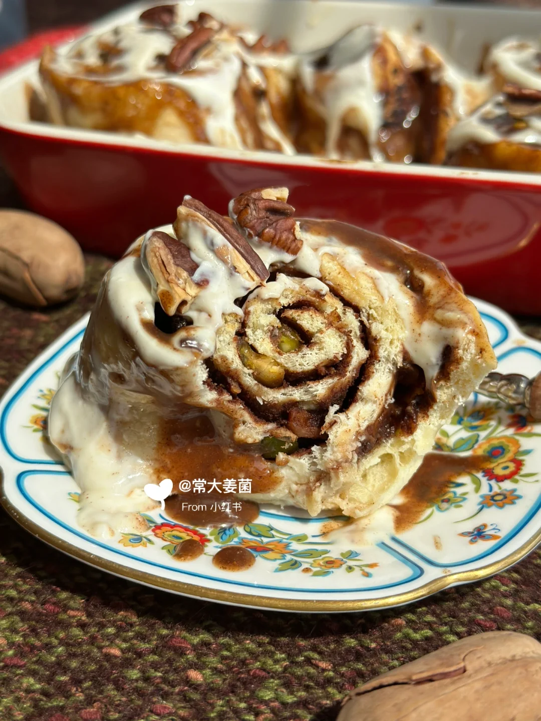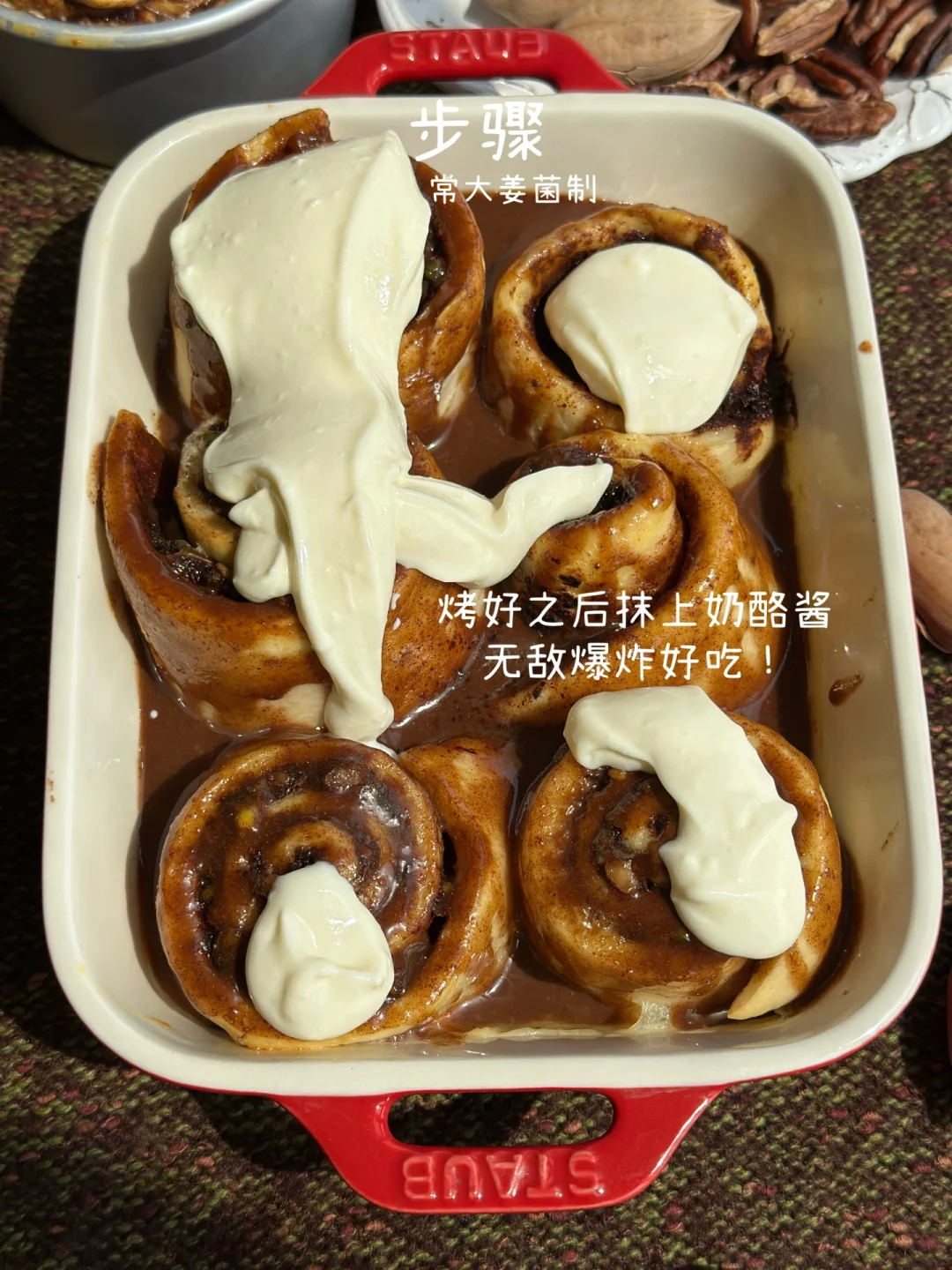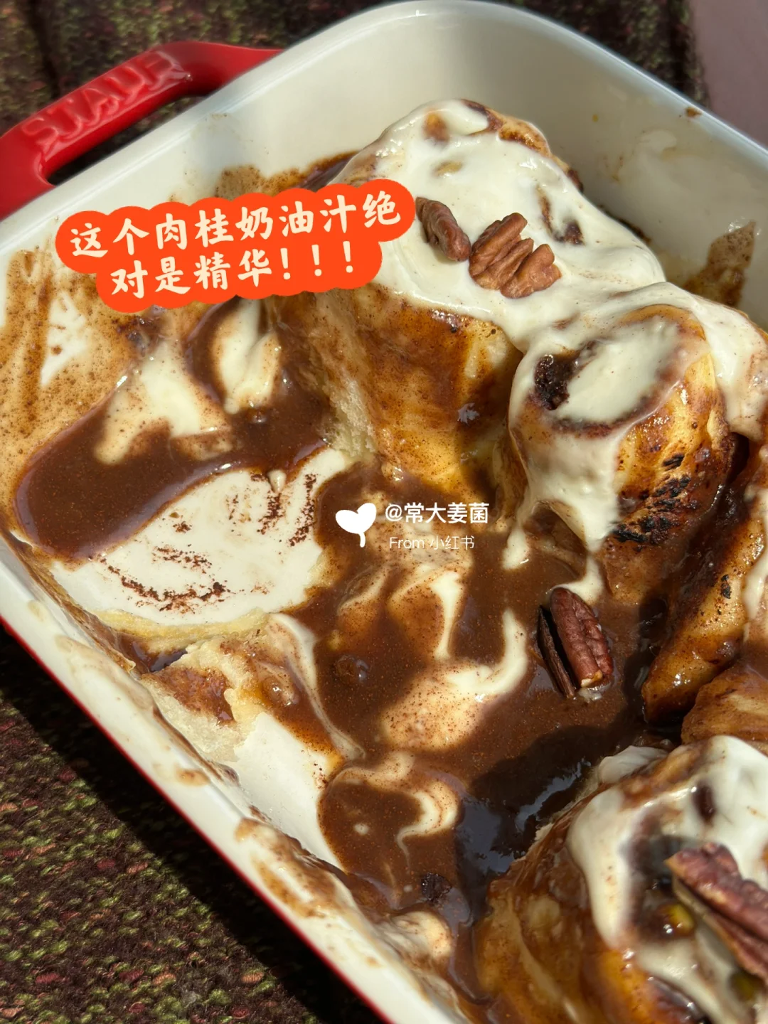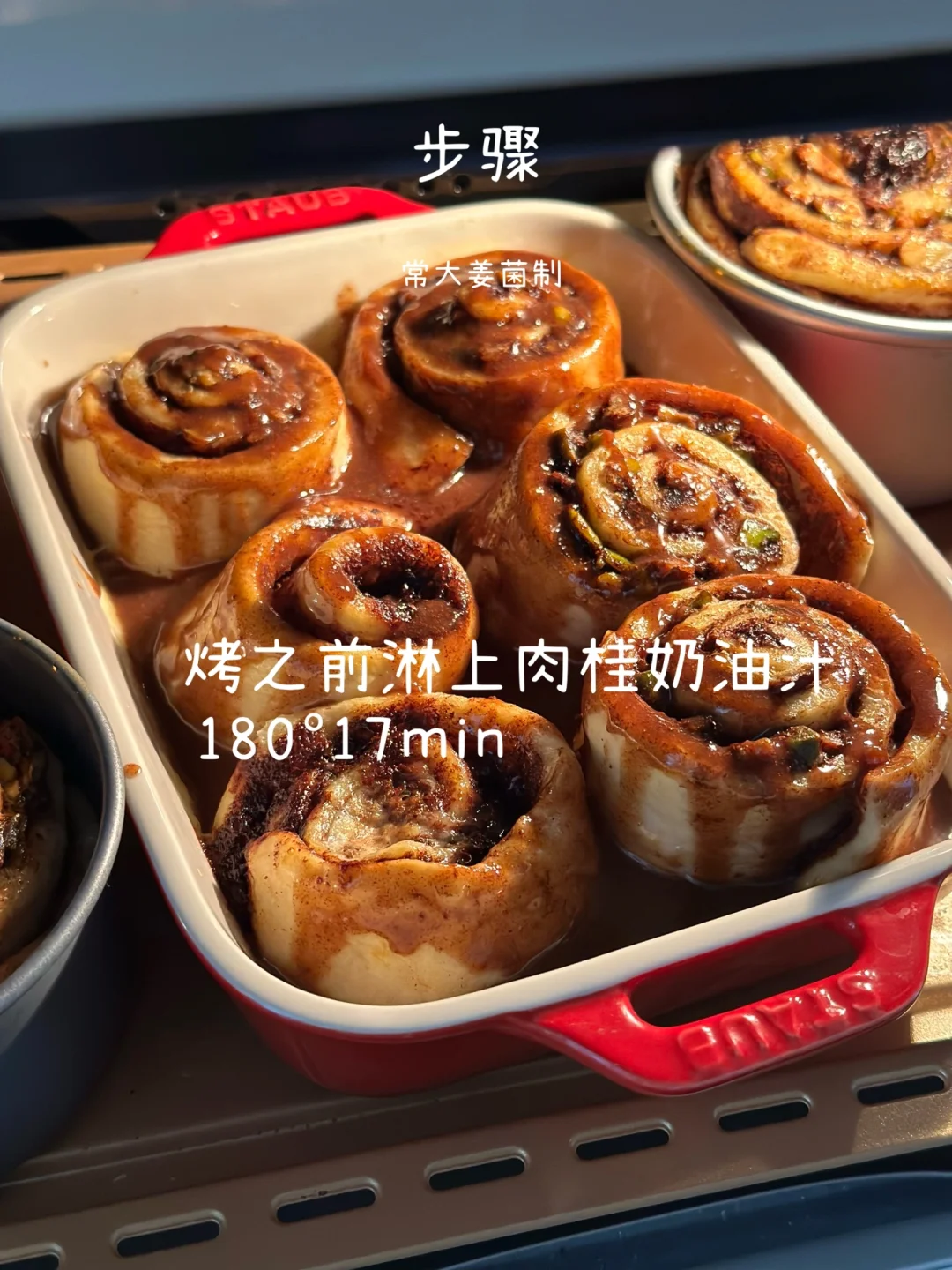 🤌🏻①中筋、高筋都做过,更喜欢高筋的口感(仅个人观点 ☝🏻②肉桂奶油汁,烤之前淋上这个,我滴妈!简直无敌爆炸了!哈哈哈,自从淋上这个酱汁后,肉桂卷成了家人最爱的糕点! ✌🏻③红糖肉桂夹层: a.个人更喜欢将肉桂粉和黄油搅合均匀涂抹,然后卷起来~同样的用料,和b做法相比口感更加浓郁,非常好吃! b.先铺一层黄油、再铺一层红糖肉桂干粉,卷起来。我吃到的大部分店售肉桂卷好像都是这种干粉制法~我个人不是很爱这种,吃起来干巴巴滴~