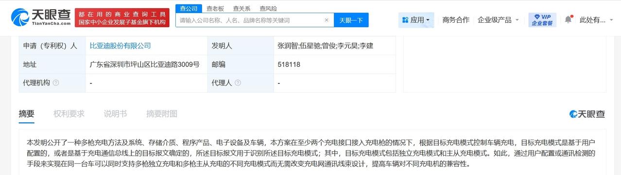 比亚迪公布多枪充电专利 天眼查App显示,近日,比亚迪股份有限公司申请的“多枪充电方法及系统、存储介质、程序产品、电子设备及车辆”公布。 摘要显示,本方案在至少两个充电接口接入充电枪的情况下,根据目标充电模式控制车辆充电,目标充电模式是基于用户配置的,或者是基于充电通信总线上的目标报文确定的,所述目标报文用于识别所述目标充电模式;其中,目标充电模式包括独立充电模式和主从充电模式。如此,通过用户配置或通讯检测的手段来实现在同一台车可以同时支持多枪独立充电和多枪主从充电的不同充电模式而无需改变充电网通讯线束设计,提高车辆对不同充电机的兼容性。