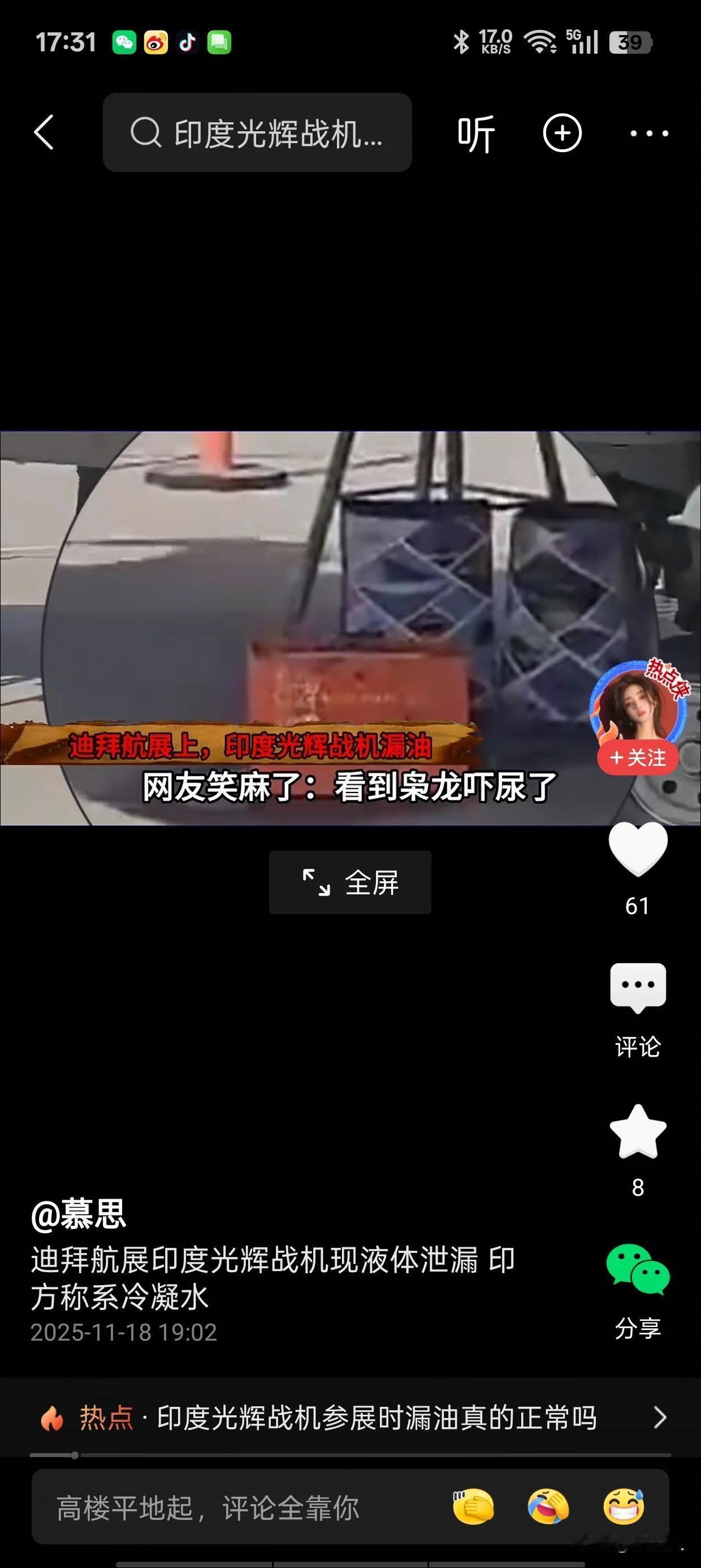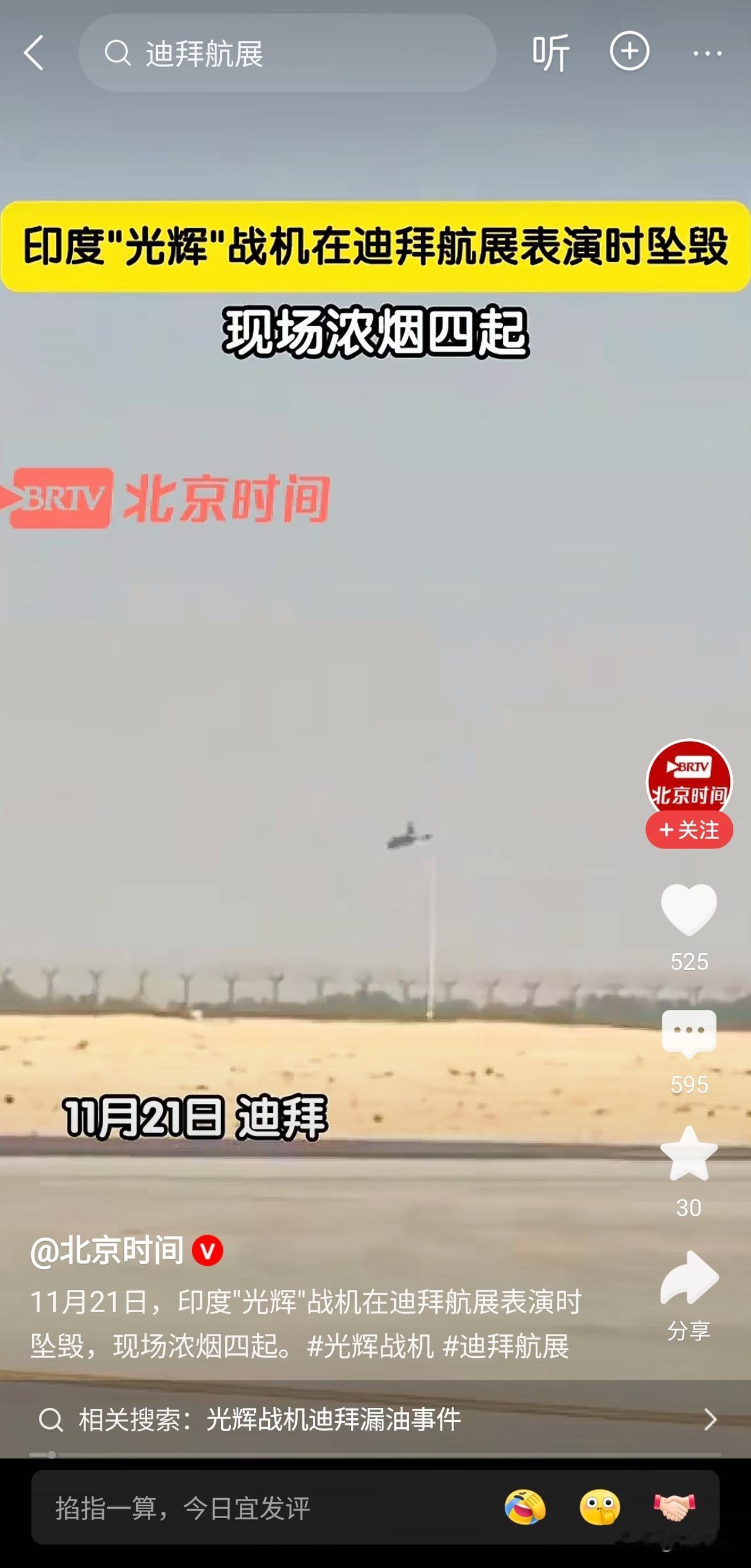 印度,光辉战机,搞了几十年才出来的所谓三四五甚至六代的战机。 迪拜航展,之前漏油,今天坠毁,很光辉,很印度。为印度飞行员默哀。