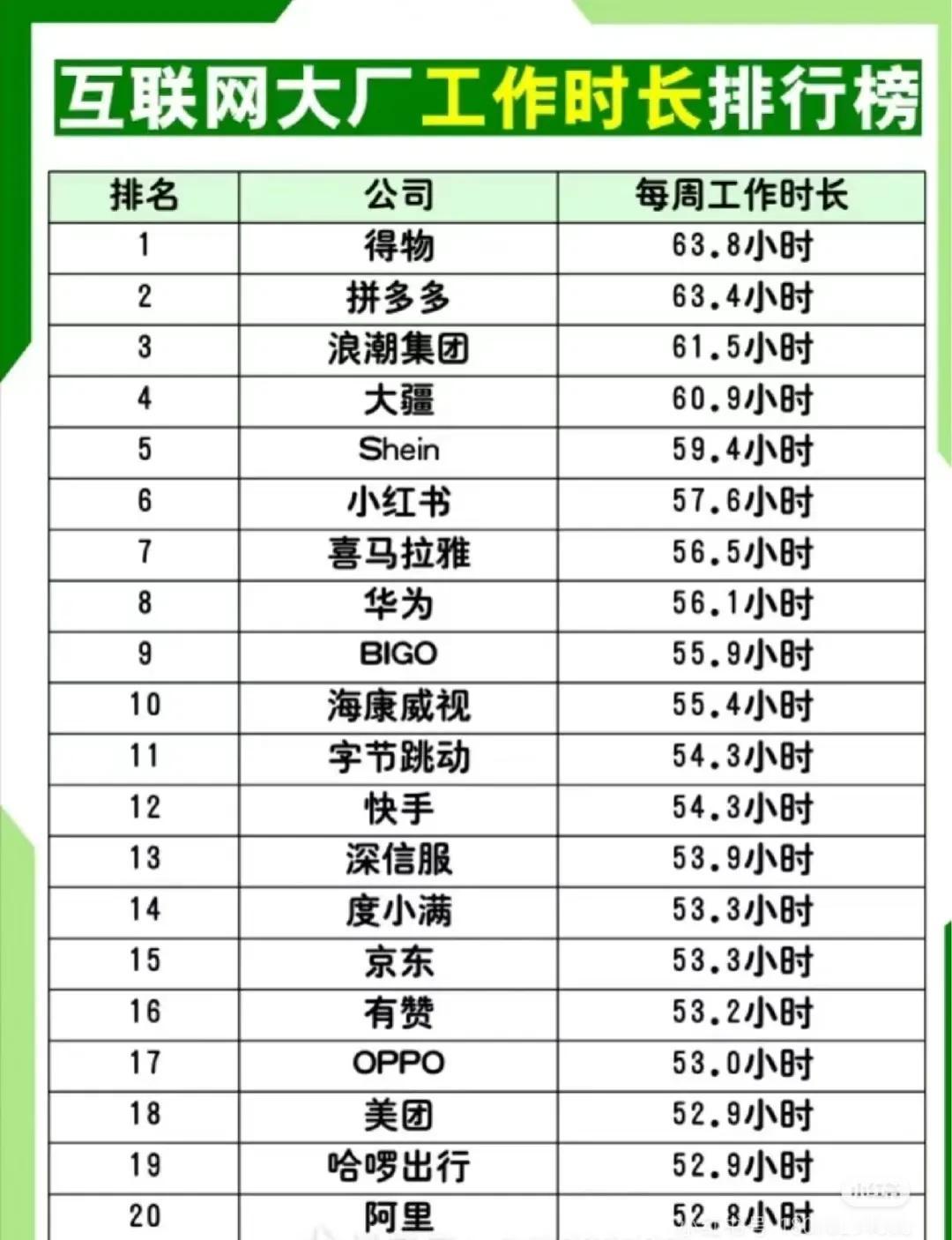各个互联网公司的每周工作时长排名,看一看哪个公司加班时间最长?排名前十里面有几个“老牌加班企业”,其中比较有名的就是:得物,浪潮和拼多多,每周工作时长60多个小时,平均工作日每天12个小时!如果按照一周六天,那么每天加班就是10个小时,比同行业公司平均多了两个小时!