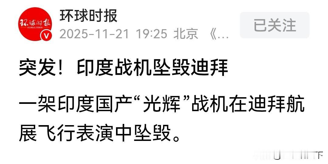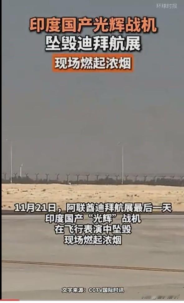 突发! 当地时间11月21日下午, 印度“光辉”战机迪拜航展坠毁 飞行员不幸身亡! 2025迪拜航展闭幕日突发惊魂一幕,印度国产“光辉”战机在飞行表演中突然失控,径直冲向地面并燃起冲天浓烟,现场观众惊呼四散。 这架承载印度航空工业期待的第三代战机,未出现飞行员弹射迹象,印度空军随后确认飞行员已死亡。事故导致后续所有飞行表演紧急中止,救援直升机与消防力量火速奔赴现场处置。值得注意的是,该机型曾在2023年迪拜航展因故障缺席表演,2024年更发生过训练坠毁事故,此次国际舞台上的再度折戟,让其可靠性引发广泛质疑 。 印度战机被毁 印度失事飞机 印度航空坠机