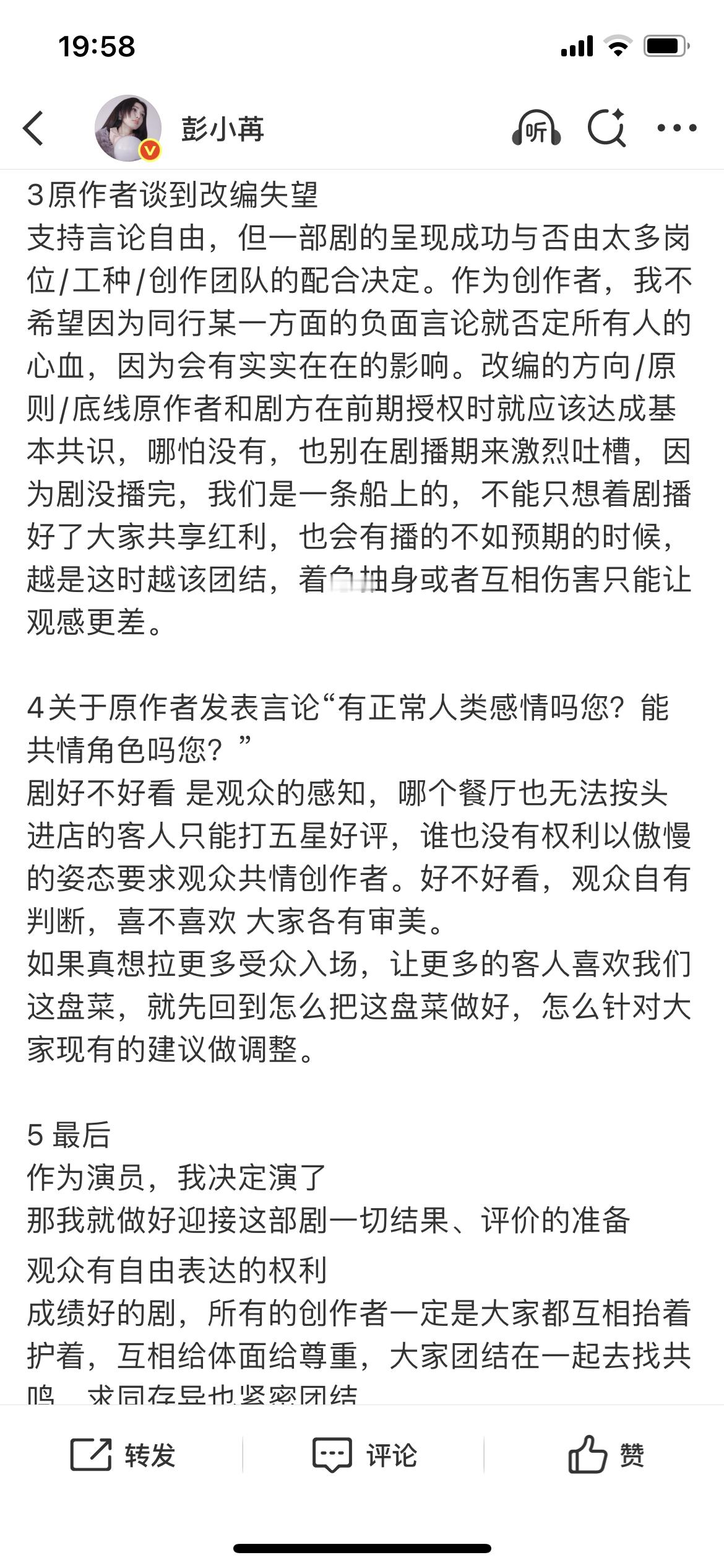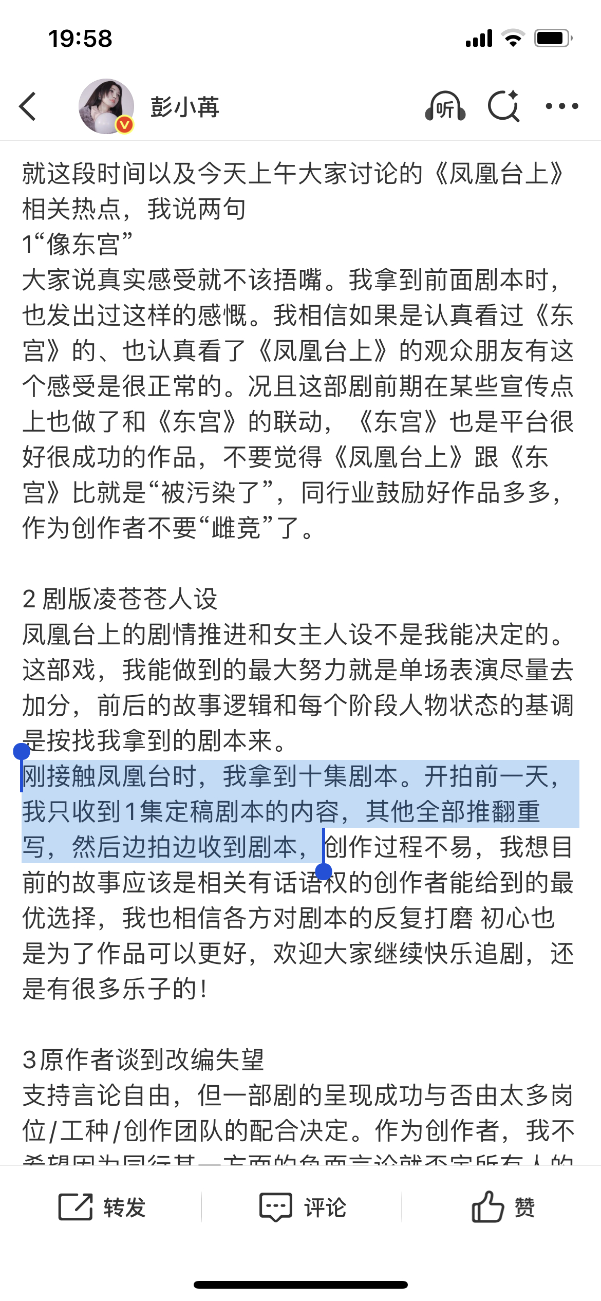 彭小苒活人感好强刚接触凤凰台时,她只拿到十集剧本。开拍前一天,她只收到1集定稿剧本的内容,其他全部推翻重写,然后边拍边收到剧本……真是太常见的操作了也谢谢她勇敢地说出来。剧烂,烂不到演员。支持小苒!!