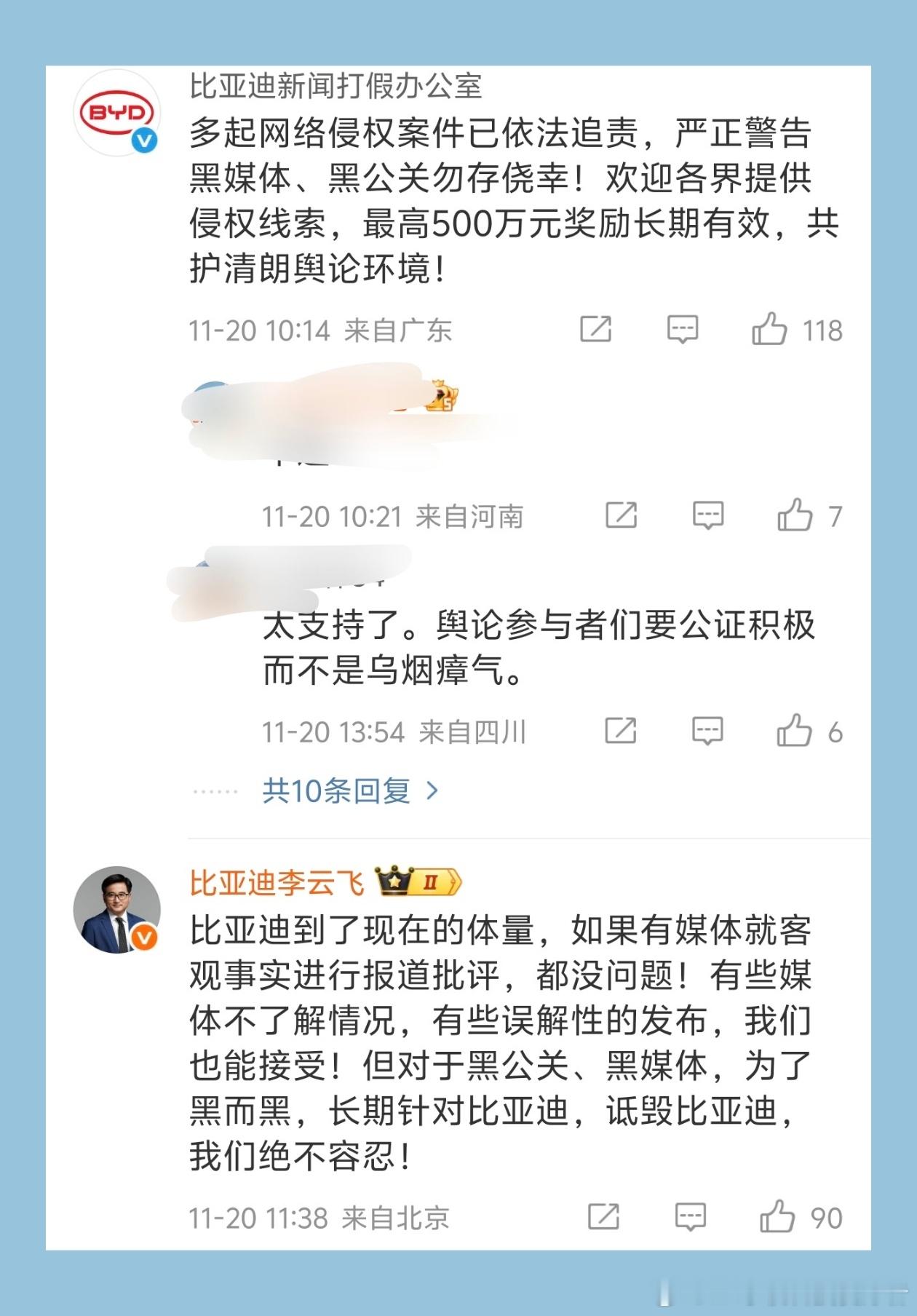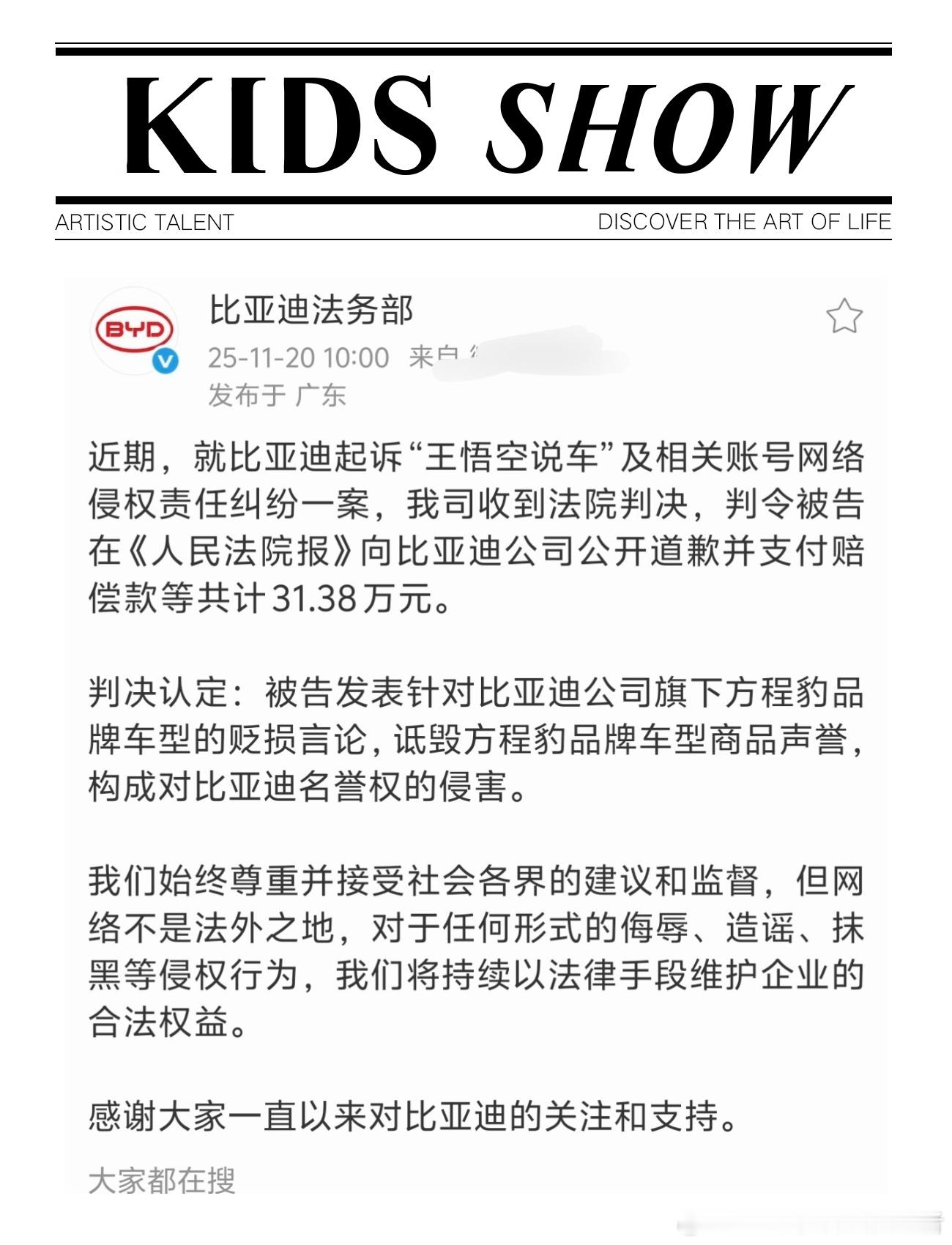 作为自媒体人,还是奉劝各位谨言慎行,不要为了热度去吃黑流量。汽车圈有很多为博主为了追求所谓的流量,又或者说是受到了诱惑铤而走险的去吃黑流量,经常发表一些极端言论,去抹黑汽车厂商。他们也清楚厂家都有公关部门,但有些人就是不听劝,最终也会遭受法律的严惩。最近,比亚迪起诉自媒体账号 “王悟空说车” 及相关主体的网络侵权责任纠纷一案结果出来了。根据法院的判定,被告发表针对比亚迪旗下方程豹品牌车型的贬损言论,已构成对企业名誉权的侵害,最终判决被告需向比亚迪公开赔礼道歉,并支付共计 31.38 万元赔偿。法网恢恢疏而不漏,之前经常看到这所谓的汽车博主,但他是经常性发表一些极端的观点,对方程豹这个品牌以及豹5这辆车进行拉踩。现如今,他的社交账号也被封禁,只能说是咎由自取。我始终认为,技术竞争才是良性之争,对于中国新能源汽车的发展来说也是有利的。这种恶意抹黑的应该严厉打击,就像李云飞所说的,接受大家的批评和建议单对于黑公关和为了黑而黑,这是不能接受的。作为自媒体,更要谨慎。
