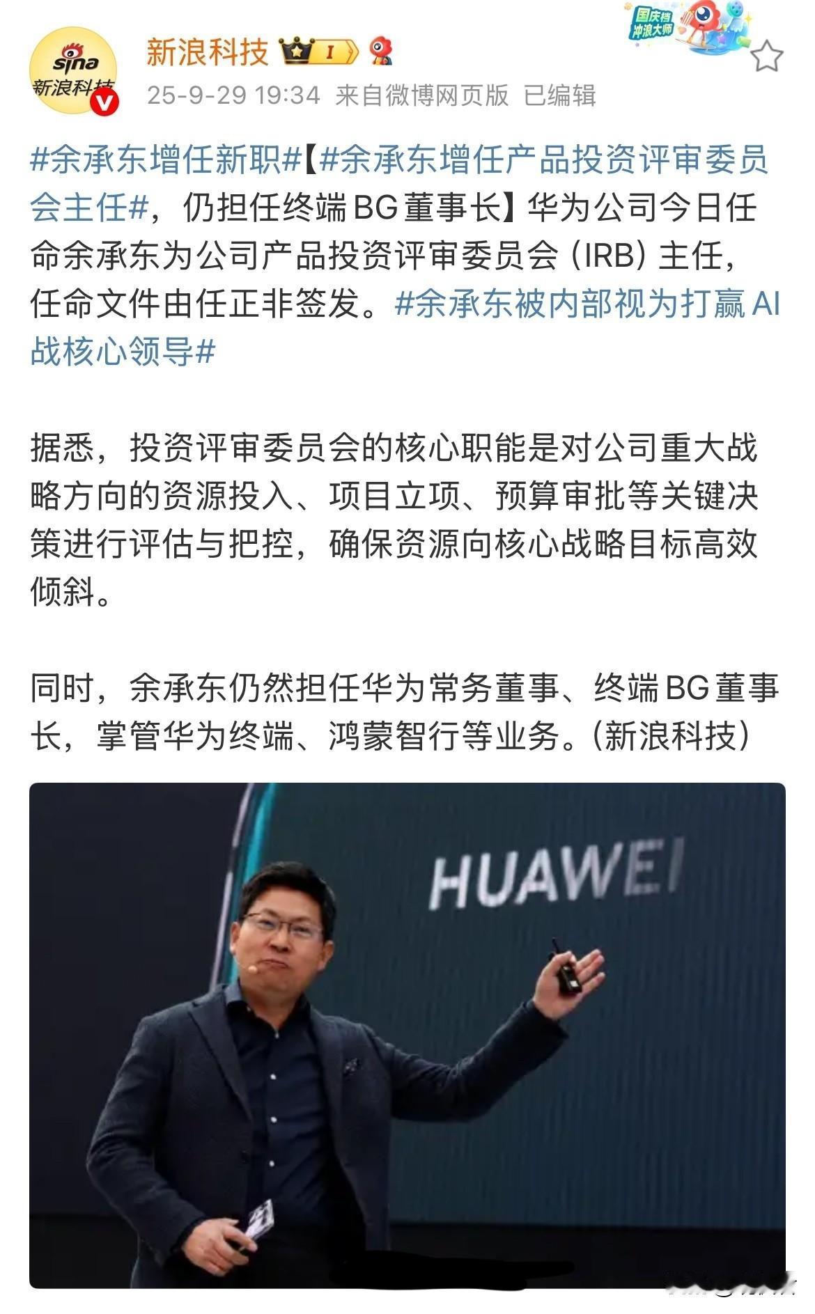 余承东升职加压,百亿元盘子扛肩上,华为关键岗位变天了。 近段时间华为内部传出人事变动,余承东获得新职位。这回他不再只是负责卖手机,得管研发钱怎么花、技术怎么攻关。听说连任正非都亲自给他发任命书,可见公司对他信任。 以前余承东只管市场销售,现在要协调各个部门资源,搞芯片、造车项目都要过他手。这么多事情压一个身上,难度不小。有员工说最近开会频率变高了,跨部门扯皮少了,但具体成效还要看后续表现。 现在华为研发投入加大,技术封锁压力还在,余承东这关能不能过,就看接下来动作了。