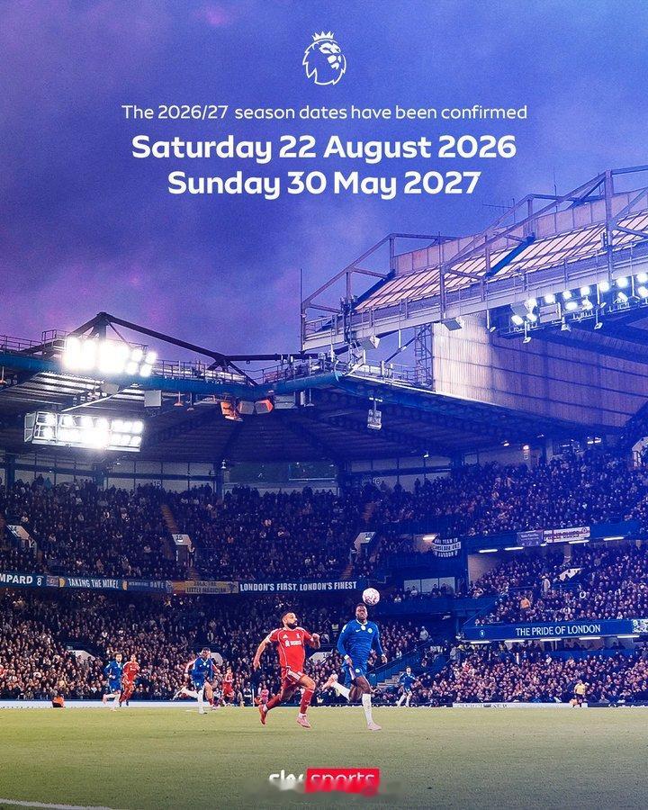 2026/27赛季英超联赛将于8月22日星期六开赛,比往常晚一周。由于世界杯决赛将于7月19日举行,英超联赛的开赛时间比往年晚了33天,这也是该赛事历史上最晚的开赛日期