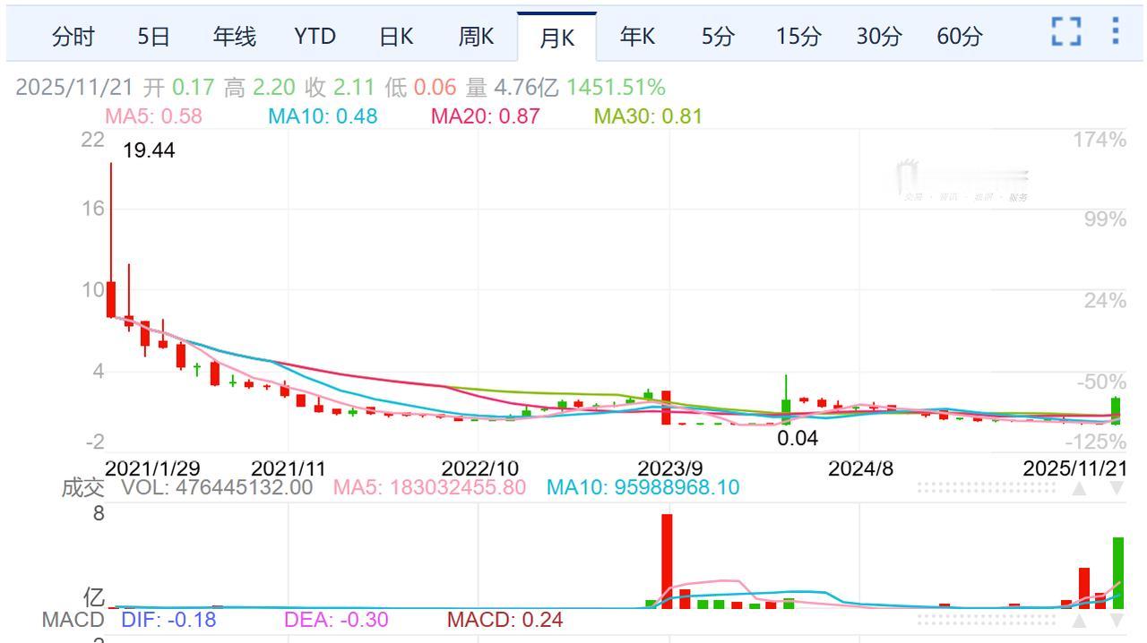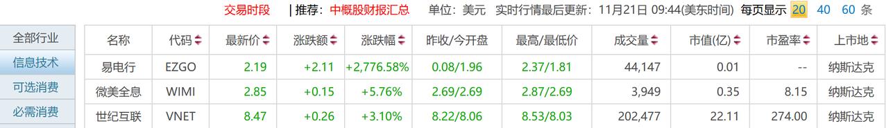 【中概股:“仙股”上涨2700%】美股中的中概股易电行,股价从0.08美分,现涨至2.20美元附近,上涨幅度超过2700%!没有涨跌幅限制,T+0交易的美股市场,真的是太刺激!然而,它却是从19美元跌至最低0.04美分啊!尽管股价能够涨2700%,但对于5美元买入的投资者而言,没有什么作用。如果观察其股本变化,907万总股本的微盘,亏损的业绩,风险也不小。