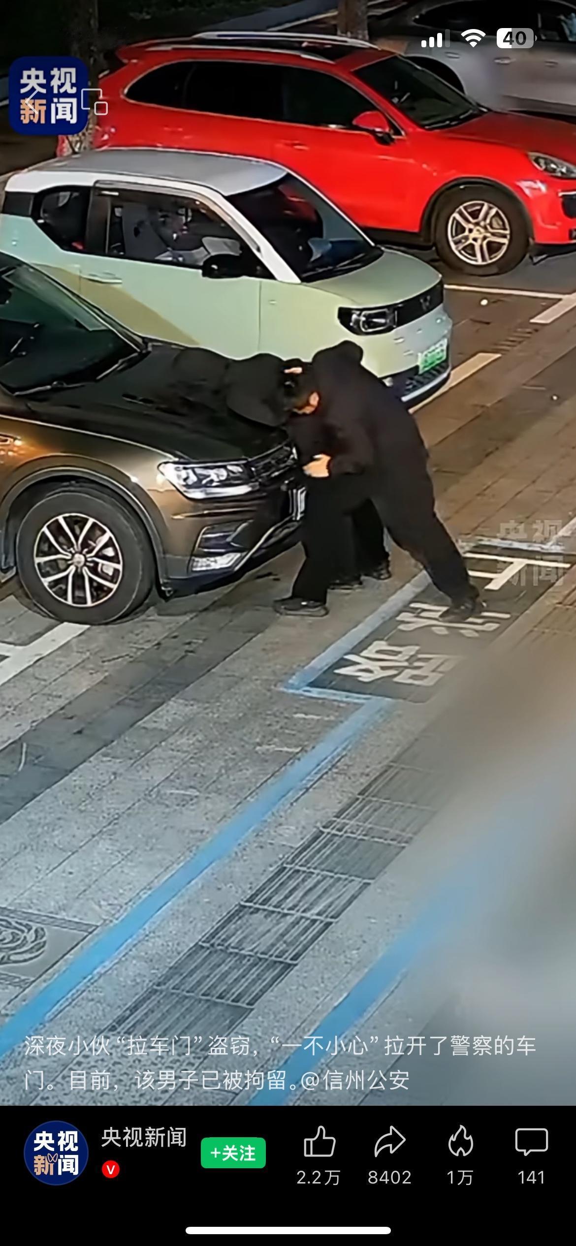 男子深夜“拉车门”盗窃,碰上正在车内休息的警察,这下自投罗网了。 真是应了那句话:常在河边走,哪有不湿鞋啊? 这真是十秒钟最快出警,最快抓获,惊不惊喜?刺不刺激?意不意外? 现在小毛贼已经被拘留了,等待他的是他该得的制裁。 不义之财不可取,有手有脚的,干点什么不行,非要踏红线!!!