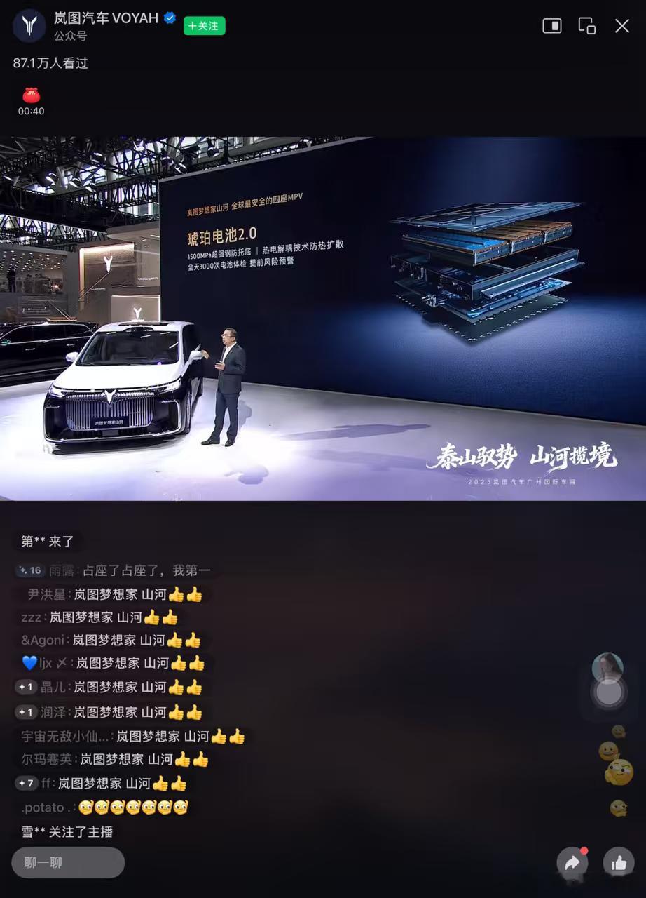 电池安全有保障?这下可以放心了...岚图梦想家山河版终于登场,周围不少朋友对新能源车的电池安全性一直心存疑虑,现在可以安心了。发布会后了解到,这款车型配备了琥珀电池2.0,其最大亮点在于高温条件下电芯不会扩散发热,从根本上解决了安全隐患。此外,电池底部还加装了特制的厚钢板,通过了比国家标准严格六倍的测试,确保在日常行驶中即使遇到小磕碰也能得到很好的保护。正如卢总在发布会上所说——‘山河永固’不仅是技术上的承诺,也是对商务精英们安全需求的深刻理解!岚图梦想家山河上市 华系最高端四座MPV