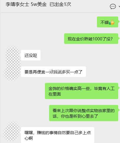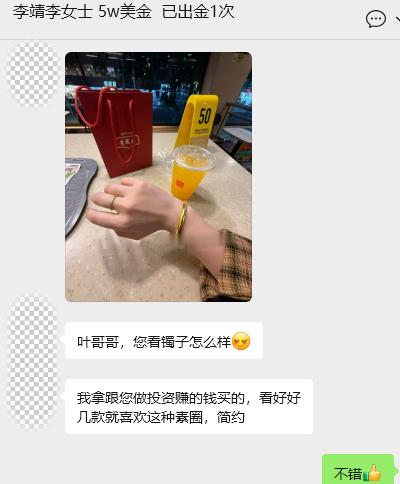果然女人都喜欢这种布灵布灵的东西上次在与百万战队李女士的聊天当中,无意谈论起黄金三、五的牛市我们准备布局黄金的中长线多单的思路,被李女士敏锐的嗅觉抓住三、五年的牛市的关键信息,便追问我实物黄金也可以吗?现货和期货黄金的价格上涨,自然也会影响到实物黄金的价格,在我明确的建议下果断的选择买入实物黄金,原本是想去银行购买的,因为银行出现新规只能转而求其次,去金店购买佩饰即使佩戴在身上,也具有一定的投资价值,这不过来给我报喜来了。看到团队朋友们的生活一步步慢慢的变好,我是真的替你们感到开心,同时我心中的成就感也是满满的。