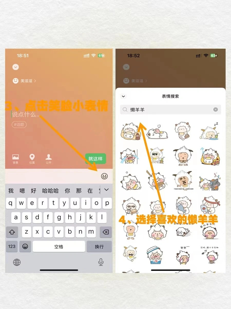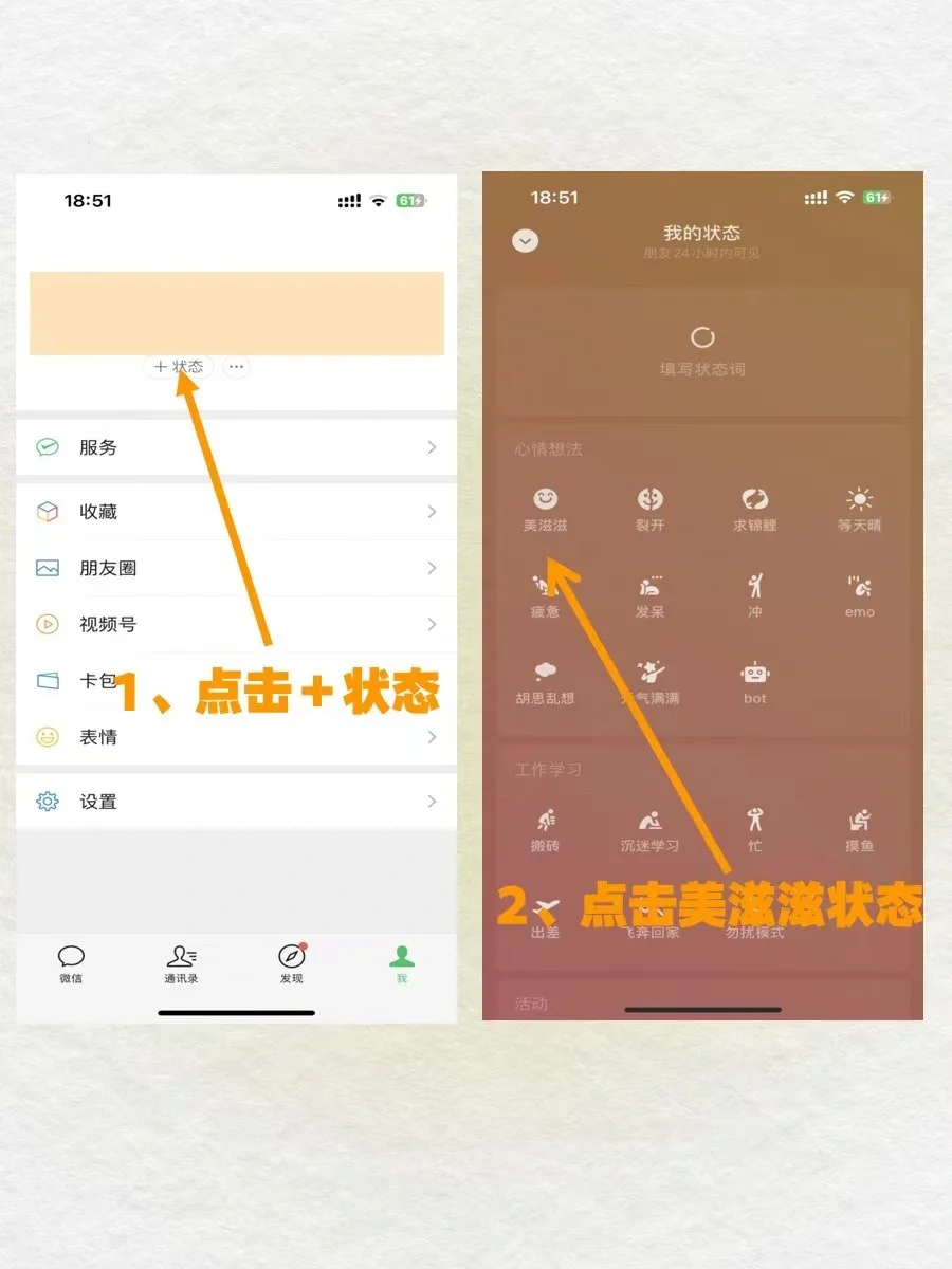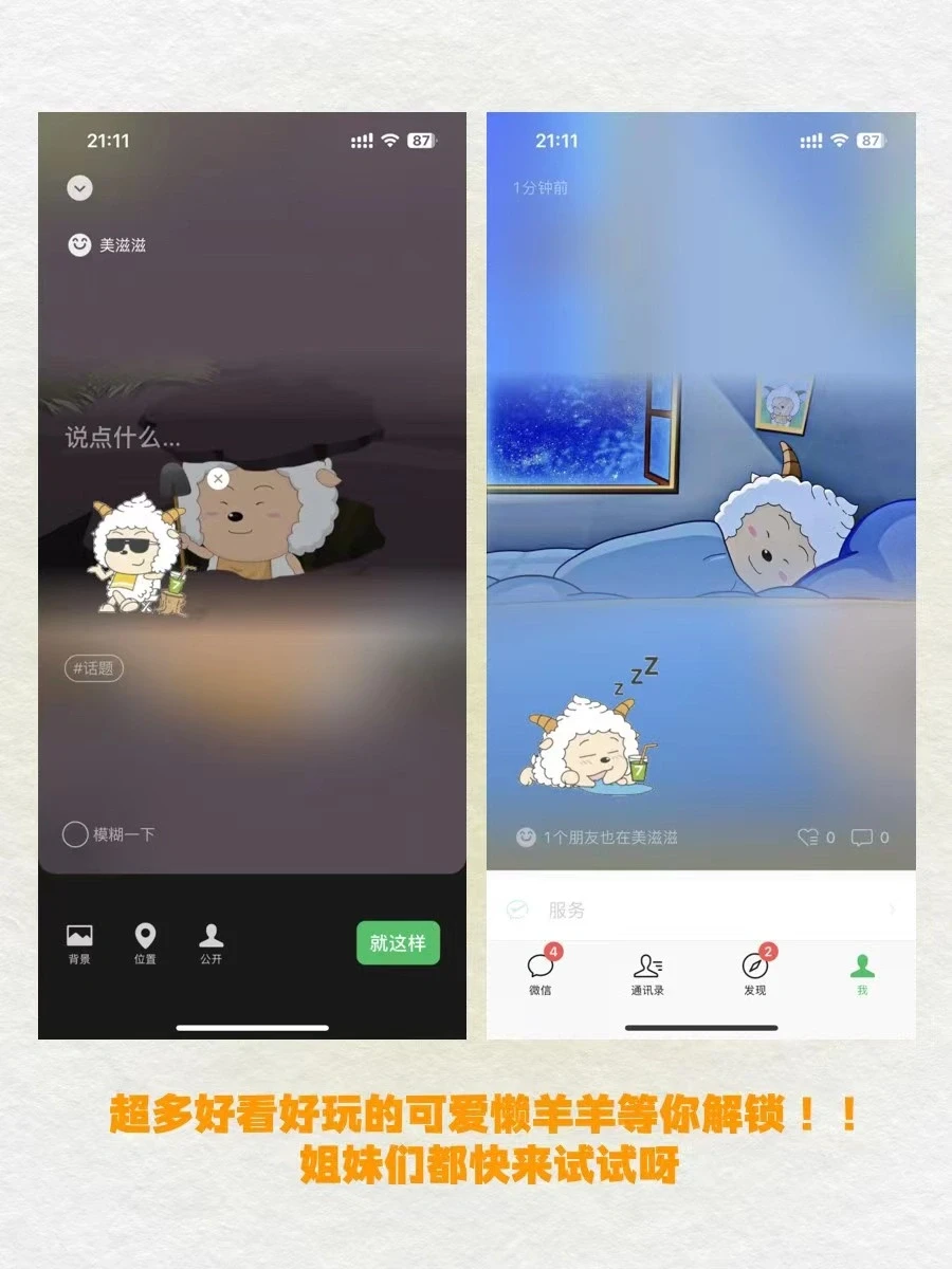 ✨微信状态里居然能养宠物啦[赞R] 🌟相信各位姐妹们肯定有看过懒羊羊动画片吧[萌萌哒R] 💖你想要的心情、想法、工作学习状态都有[飞吻R] 🌷大家快来一起养一只喜欢的宠物吧[喝奶茶R] 1️⃣点击状态 2️⃣点击美滋滋 3️⃣点击笑脸小表情 4️⃣选择喜欢的小宠物 5️⃣姐妹们你的专属懒羊羊就好啦✅ 🌈还有超多有趣可爱的状态等你来玩✨~ 💫快来跟欣欣一起领一只专属懒羊羊吧[色色R]