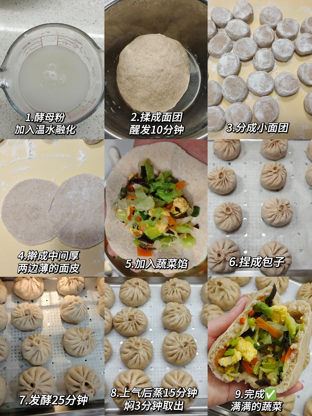 营养师家的餐桌 自制包子 吃出健康 . 很多妈妈反馈孩子不吃蔬菜,可以多试试把蔬菜“藏起来”,就容易接受了,比如蔬菜包子、蔬菜饺子、蔬菜饼等~ . 包子皮里加了一半的全麦粉,增加膳食纤维和饱腹感,还能补充一部分维生素B族。