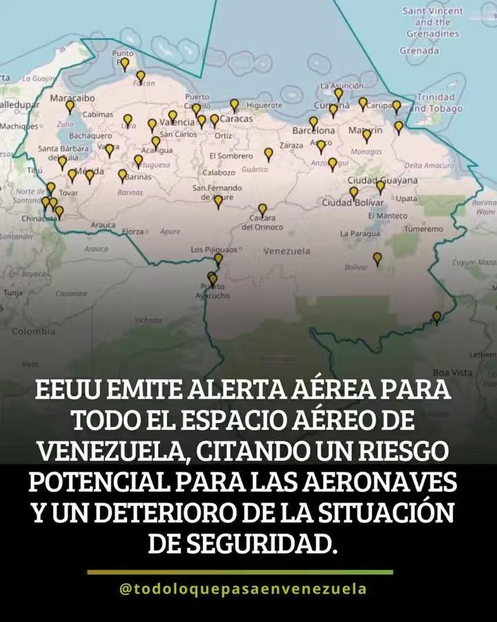 突发新闻|美国封锁委内瑞拉领空 美国对整个迈克蒂亚飞行情报区(涵盖委内瑞拉和部分加勒比地区)发布了特别空中警报,警告称由于安全形势加速恶化和全国军事活动增加,飞机面临潜在风险。 美国联邦航空管理局要求所有飞越该空域的航班都必须格外谨慎,并提前 72 小时发出通知。