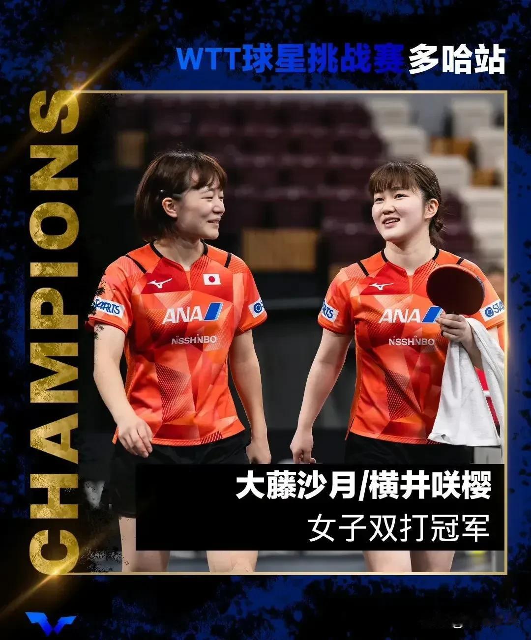 2025年首站WTT球星挑战赛(多哈站)女双冠军组合大藤沙月/横井咲樱获得2025年最后一站WTT球星挑战赛(马斯喀特站)女双🏆 大藤沙月获得今年6站WTT球星挑战赛中的4站女双冠军🏆🏆🏆🏆(2次搭档张本美和,2次搭档横井咲樱) 截止WTT球星挑战赛马斯喀特站2025 WTT球星挑战赛女双夺冠次数: 4冠:张本美和,大藤沙月,长崎美柚 3冠:木原美悠 2冠:王曼昱,陈幸同,蒯曼,申裕斌,田志希,横井咲樱 1冠:孙颖莎,陈梦,王艺迪,钱天一,石洵瑶,张翔宇,桥本帆乃香,佐藤瞳,安藤南