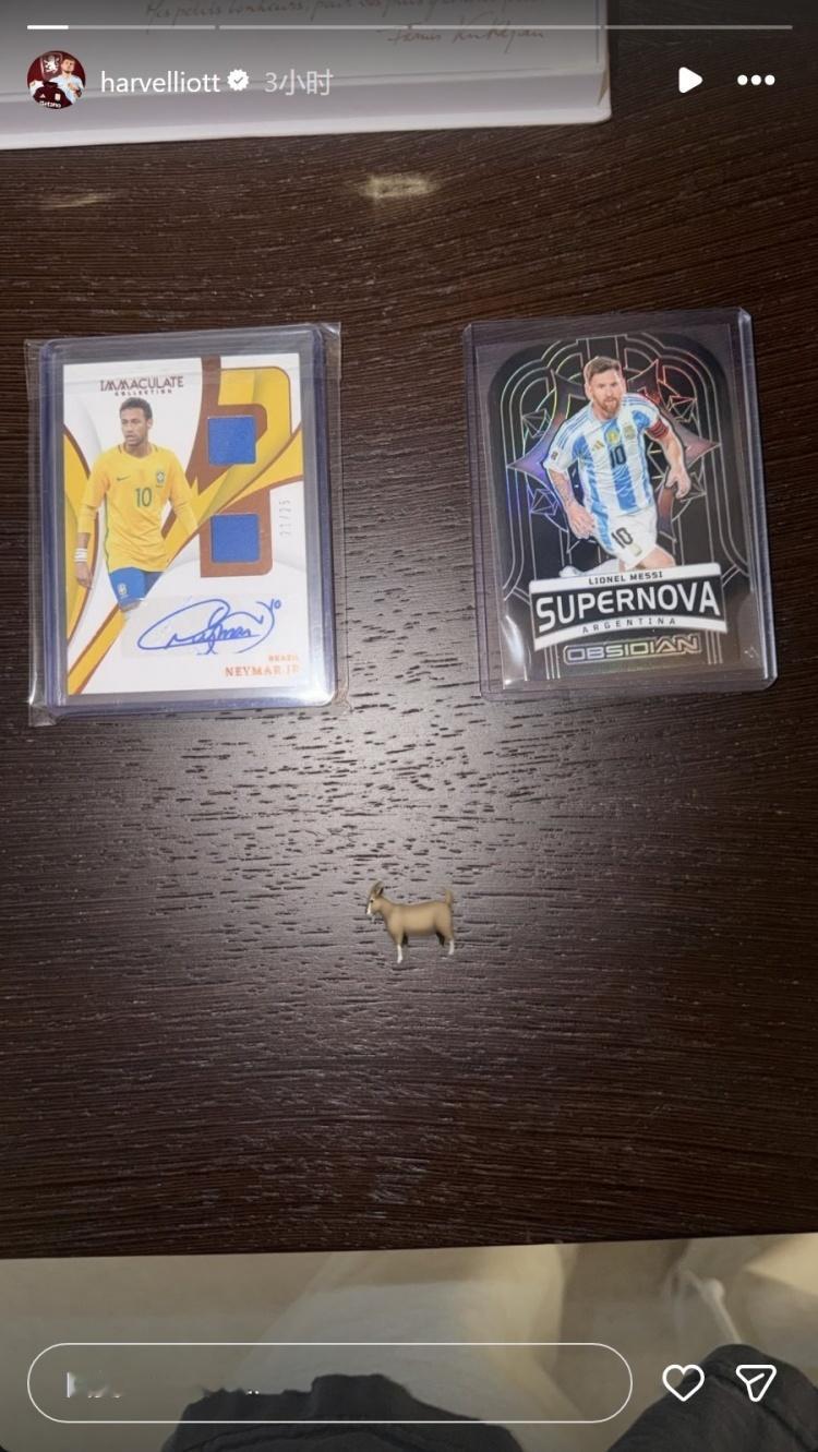 利物浦埃利奥特社媒晒出梅西、内马尔的球星卡,并配上了山羊(GOAT)的表情符号。