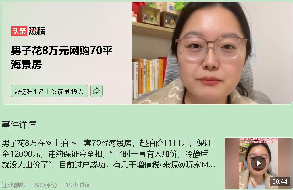 8万块买70平海景房?听上去像做梦,但真有人抢到了!不过——这到底是“捡漏”还是“大坑”,你得先冷静想一想。 这场拍卖从一开始就有点“戏多”。起拍价才1111元,结果一堆人拼命加价,最后冲到7.9万成交。可你想过没:谁在背后抬价?是不是有“托儿”?很多这类拍卖都设了“保护价”,没到这个数,根本卖不掉。 便宜是真便宜,可风险也一点没少。这种商业拍卖不像法院拍卖,没人给你清场。万一房子里还住着人,或者签了十年租约,你怎么办?还有税费、佣金、服务费……零零总总加起来,可能还要多掏6%。 再说乳山这地方,海景房早就不是“稀缺资源”了。二手房满天飞,五万以下的房子一抓一大把。有些中介低价收、加价卖,“1元起拍”就是个吸引眼球的噱头。 如果你心动想跟风,记住这几点: 一定去现场看!视频可以造假,海景可能被挡,格局也许根本不对劲。 查清楚产权,有没有被抵押?被查封?有没有长期租赁合同? 别被气氛带着走!设好心理价位,别一上头就加价。 说到底,天上掉的“馅饼”,往往连着“陷阱”。这年头,躺赚的机遇太少了,躺坑的几率反而更高。你,敢试吗?