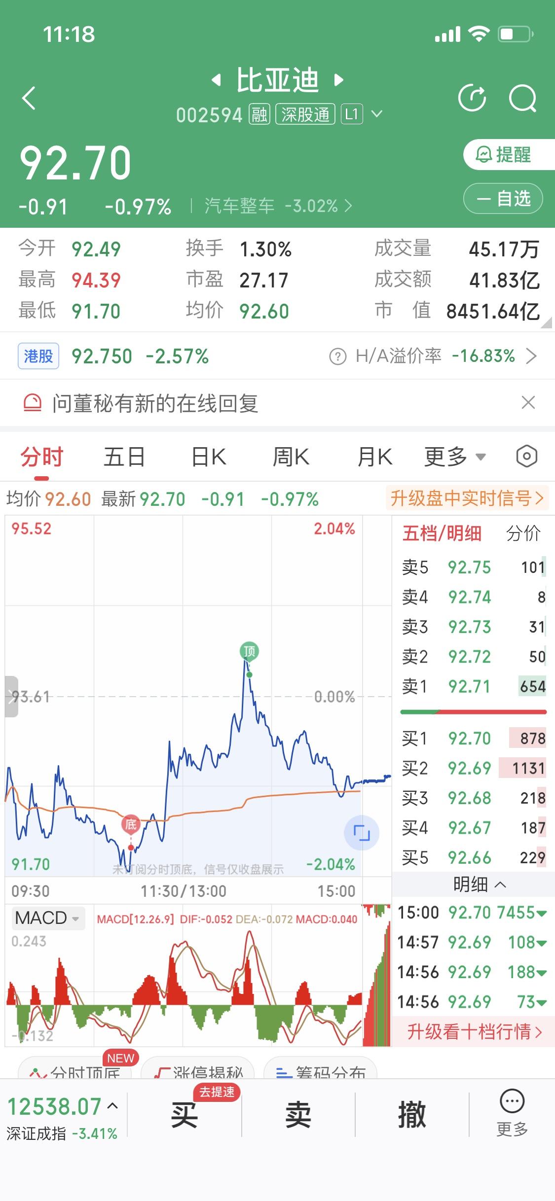 11月22日这一天,A股市场那叫一个惨,大面积大幅度下跌,一片“绿海”。不过,比亚迪股票却像个特立独行的勇士,在悄悄拉升。上午最低跌到91元多一点,到收盘的时候是92.7元,还走出了十字星状态。这明显是有资金在偷偷低吸啊。 从这走势来看,短期91元这个位置可以看成是一个支撑位。说不定这就是反弹的开始。比亚迪作为汽车行业的巨头,技术实力和市场份额都有一定优势。股票在大盘下跌时还能有这样的表现,说不定后续会有不错的行情。大家可以多留意留意。