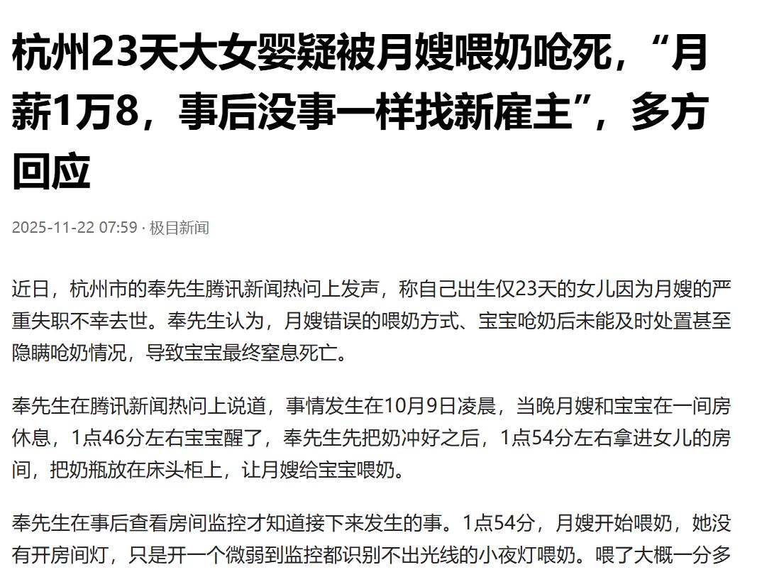 浙江杭州,男子花了18,000元请了一个月嫂,结果,他23天的女儿,在喂奶中被呛到,月嫂还说“来来来,再来喝哦”,直到男子和妻子进来,月嫂还不知道宝宝已经呛奶了,后来宝宝嘴唇发紫了,月嫂才说要送去医院,事后月嫂还不说是实话,导致孩子离世,事后月嫂像没事一样,继续寻找下一个雇主。 凌晨1点多,奉先生听到女儿的哭声,就知道女儿饿醒了,他就赶紧起来冲奶,冲好奶之后,就拿进女儿的房间。 他的女儿和月嫂同一个房间,月嫂此时也起来了,拿起奉先生准备好的牛奶,就开始给孩子喂奶,此时奉先生也回到自己的房间了。 他上了一天的班,晚上还要起床帮忙冲奶,也挺累的,他回房间就想和妻子继续睡觉。 有月嫂照顾他们的女儿,其实奉先生和和妻子是很放心的,这个月嫂可是他们花了18,000元请来的,在请月嫂来照顾他们女儿之前,他们已经确认过,这个月嫂是经过专业训练的,带过六七个孩子,值得信赖。 这个月嫂也确实很自信,伸手拿来奶瓶,就开始给孩子喂奶,她自信到没有开房间灯,只是凭借一个小夜灯给孩子喂奶。 这个小夜灯,灯光非常微弱,但是,这个月嫂可能是觉得,只是给孩子喂奶而已,根本不需要开灯。 然而过了大概一分钟,奉先生和妻子听到了孩子的呛咳声音,一下,两下,三下…… 他们在迷迷糊糊中听到孩子的呛咳声,一开始的时候,他们还不是很在意,毕竟有月嫂照顾孩子,有什么情况月嫂也可以处理。 但是,宝宝开始发出了哭声,大哭声与平时那响亮的哭声不一样,孩子一哭就哭了30秒左右。 奉先生和妻子听到孩子的哭声,他们都非常揪心,只是希望这个月嫂赶紧哄孩子,让孩子喝饱奶继续睡觉。 迷迷糊糊中,他们又听到月嫂说:“来来来,再来喝哦!” 听到月嫂的声音,奉先生和妻子以为,月嫂已经在哄孩子了,孩子应该很快就能安静下来。 然而孩子并没有停下哭声,一哭就哭了几分钟,直到月嫂开灯观察孩子的情况,奉先生才觉得不对劲,这才赶紧过来看孩子。 奉先生一进来,就问月嫂:“宝宝到底是怎么了?” 月嫂也很茫然,还以为是宝宝不好好喝奶,就跟先生说:“宝宝吃喝了一两口奶,就不好好喝了。” 奉先生看着孩子依然发出奇怪的哭声,咳也咳不出来,哭也哭不痛快的样子,就问道:“会不会是宝宝呛到奶了?” “不是啊,呛到了,不是这样子的。”月嫂赶紧回答,她依然没有意识到宝宝是真的呛奶了。 “那宝宝到底是怎么了?”奉先生看着孩子的哭声越来越奇怪,就着急地问道。 月嫂没有回答奉先生的话,但她好像也明显害怕了,也赶紧让孩子趴在她腿上,按照呛奶处理,拍宝宝的后背。 然而接下来发生的事情,月嫂处理的方式更让奉先生感到疑惑。 奉先生已经明显看到自己的女儿口中流出了粘液,就像是呛奶从气管流出来的粘液,而且此时孩子已经哭不出声来了。 月嫂这个时候却说:“宝宝平时都是吃了之后才拉的,怎么今天提前拉了。” 奉先生看着孩子,明显就不是在拉屎,月嫂却说孩子在拉屎,他就觉得很奇怪。 正好这时候奉先生的妻子,也觉得孩子不对劲,过来看孩子了,她看到孩子的嘴唇已经发紫了,就知道孩子不对劲,就反问月嫂:“宝宝嘴唇都发紫了,这正常吗?” 这一句话,才让月嫂感到事情的严重,这才说,把孩子送到医院吧。 来到医院之后,医生问孩子到底发生了什么情况,由于是月嫂照顾孩子的,奉先生就让月嫂陈述过程,结果月嫂只是说孩子呛奶了两分钟就成这样子了。 月嫂的回答影响了医生对孩子的诊断,导致孩子抢救了几天之后失去了生命。 整个过程,奉先生和妻子对月嫂的处理方式都非常不满。 首先是孩子呛奶的时候,月嫂没有对孩子作出正确的判断,继续给孩子喂奶。 其次,孩子已经确认是呛奶了,奉先生的妻子让月嫂给孩子做海姆立克,但是月嫂却没有正确地使用这个方法,也就是月嫂之前说自己受过急救培训,这些都是谎言。 最后,带孩子来医院,月嫂也没有把真实情况告诉医生,导致医生没有及时做出判断,害得孩子离世。 事情发生之后,月嫂还报了警,说是因为孩子有基础疾病,所以才离世的,她坚决否认自己有责任,甚至拒绝出于人道主义,退回一个月工资。 更让奉先生和妻子感到无法接受的是,发生这样的事情,月嫂竟然就像没发生过这样的事情一样,继续去寻找下一个雇主。 发生这样的事,奉先生和妻子久久没有从丧女之痛中走出来,更是对这个月嫂感到非常气愤。 这件事要判断月嫂是否要承担赔偿责任,则要看月嫂是否有过错。 《民法典》第1165条规定:行为人因过错侵害他人民事权益造成损害的,应当承担侵权责任。 在这件事的过程中,很明显的是,这个月嫂是有很大的过错的,她应当承担赔偿责任。 那么你对这个月嫂的做法有何看法呢?来源:极目新闻 2025年11月22日