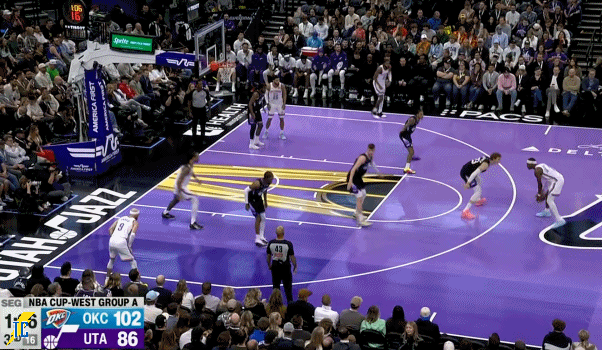 杰林投进第4记三分,亚历山大单打马尔卡宁投进撤步三分,随后米切尔也快攻扣篮得手,打了六分多钟爵士只拿两分!