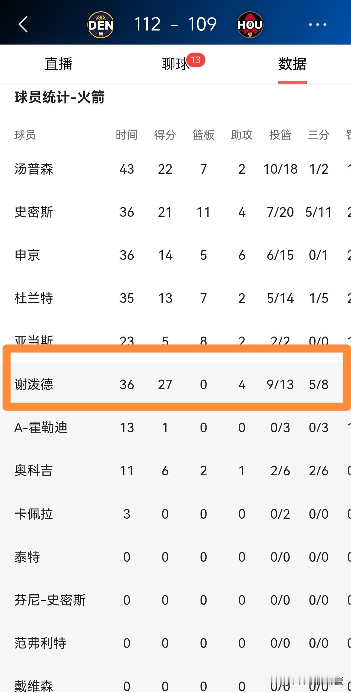 火箭超级新星谢波德真是太闪耀了!虽然今天火箭在主场以109:112不敌掘金,但是谢波德在攻防两端的表现都非常闪耀。 整场比赛下来,谢波德替补出战36分钟,投篮13中9,其中三分球8中5、罚球6中4非常高效的砍下27分4助攻2抢断,仅仅出现了1次失误,他的场上正负值为全队第二高的+13。 毫不夸张的说,此役谢波德绝对是火箭阵中表现最好的球员,当家球星杜兰特完全成为了谢波德的陪衬。