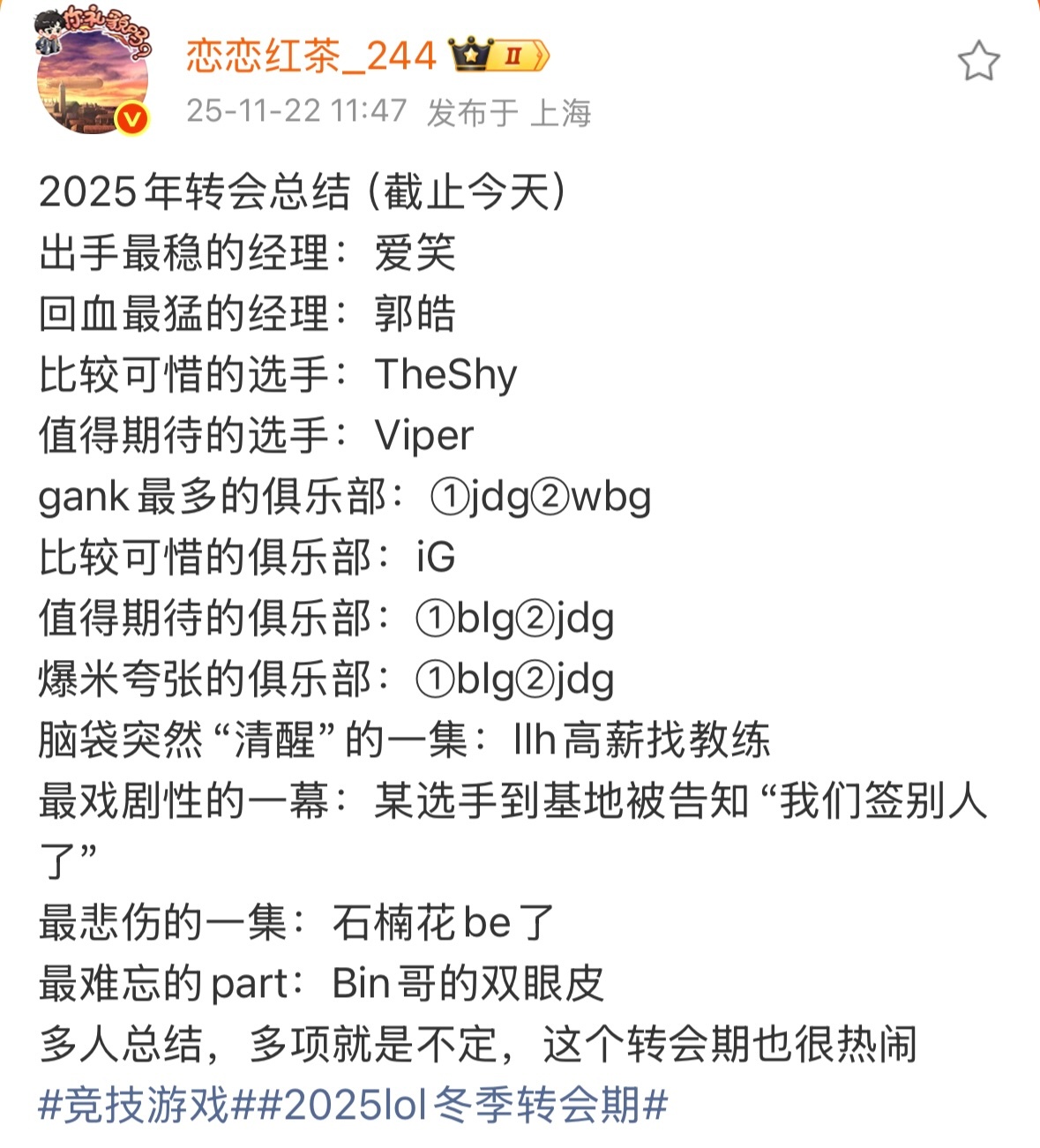 恋恋红茶的2025转会期总结大家觉得总结的怎么样