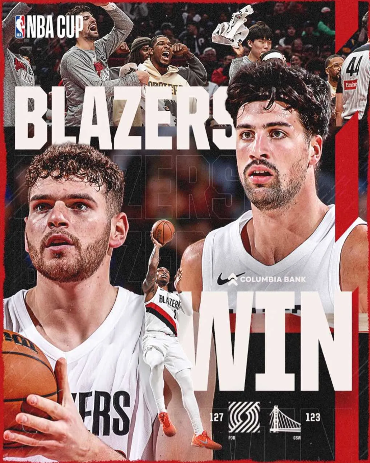NBA杯小组赛,勇士123-127不敌开拓者。 赛后,开拓者社媒分享本场比赛获胜海报并配文:开拓者获胜! 本场获胜后,开拓者常规赛战绩来到7胜9负。