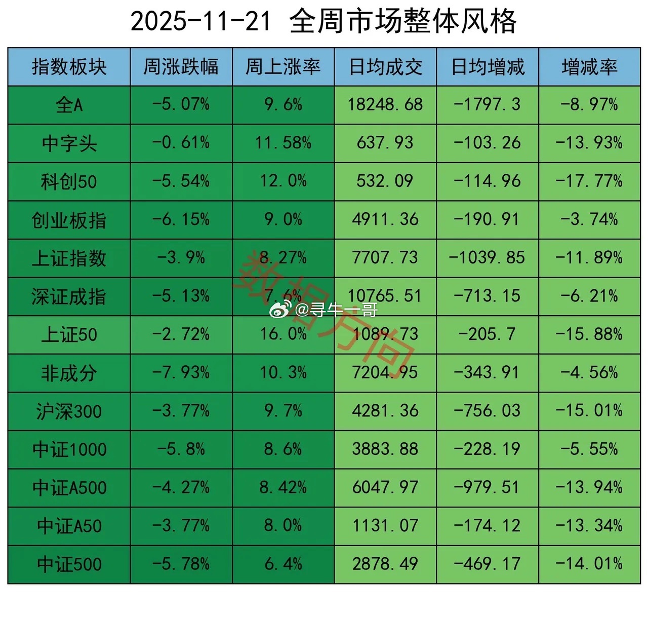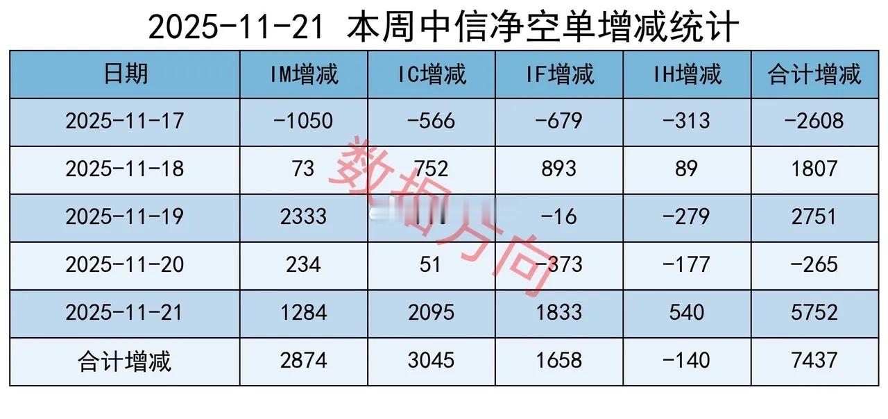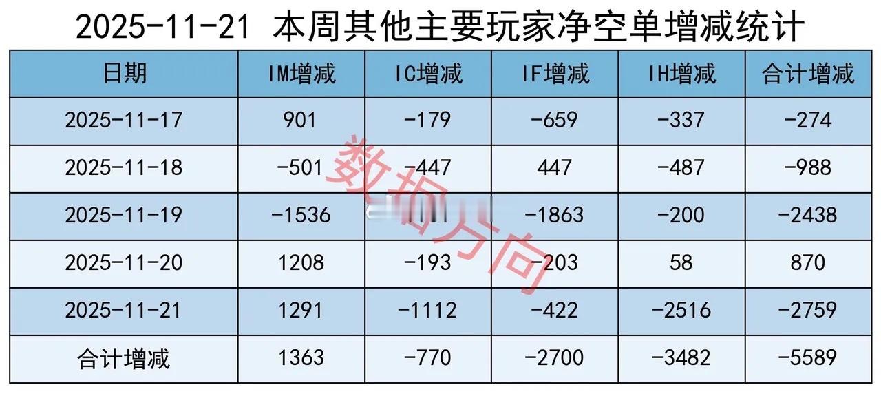 A股周跌3%,虽然机构加空,但结构特征明显!本周,大盘全线调整,全A指数跌幅5.07%,个股上涨率只有10%,日均成交1.82万亿,较上周缩量9%。所有宽指全部缩量下跌。中字头,周跌幅0.61%,在所有宽指中跌幅最小。进入四季度以来,中字头开始持续走强。其在10月份的涨幅为6.23%,11月份截至目前的涨幅为1.9%,在所有宽指中持续领跑。大操盘手提前洞悉了市场变化,转而拥抱核心资产。数据方向从10月初开始反复提示这里,及时转向者应该能够有所斩获。非成分,周跌幅7.93%。之前大盘涨的时候就没有跟着涨,现在大盘开始调整了,反而跌得更凶,实在惨不忍睹。科创50、创业板指,周跌幅分别为5.54%、6.15%。至少之前有不错的涨幅,上车早的人还有安全垫,可惜了那些高位站岗者。对全周数据复盘,机构们采取了加空的操作。行业本周,所有31个申万一级行业全部下跌。银行,周跌幅0.89%,在所有行业中跌幅最小。前文所述的中字头周跌幅为0.61%,加上银行,这些都是某队绝对控股的地方。多的话就不说了,有些事情只能意会。传媒,周跌幅1.25%,个股上涨率28%,此数据在所有行业中最高互联网电商、AI应用等小范围活跃。中国的AI可能正在赢得未来。最新数据显示,中国AI大模型在全世界的下载量已高达62%,相比之下,美国只有35%。因为我们以开源为主,他们以闭源为主,所以这种差距可能还会继续扩大。阿里宣布“千问”项目全力进军“AI to C”市场。未来计划将地图、外卖、订票、办公、学习、购物、健康等各类生活场景接入千问App,让其具备更强大的能力。期指持仓某信,本周加空7437手;分别对IF、IC、IM加空1658手、3045手和2874手,仅对IH减空140手;全周,加仓买单12732手,加仓卖单20169手。其他主要玩家,本周减空5589手;对IM加空1363手,分别对IH、IF、IC减空3482手、2700手、770手;全周,加仓买单39904手,加仓卖单34315手。大盘本周全线下挫,两者合计加空1848手,起码不是好信号,只不过加空的力度弱于下跌的幅度。本周之所以跌幅较大,与外围的变化有很大的关系。一个是,老美降息预期减弱,美股持续调整,周四更是由涨2%到跌2%,带来了一定的恐慌;另一个是,日本的挑衅言论,并且拒不收回,这是他们1945年以来首次强烈威胁东大的领土安全。虽然本周加空1848手,但结构特征明显,合计对IH、IF减空4664手,合计对IC、IM加空6512手。说明有资金在护盘,只不过没有那么明显。本周,大盘股的表现已经明显好于小盘股,如果下周继续跌,相信大盘股仍然是维稳的中坚力量。另外,本周同时加仓买单、加仓卖单,并没有平仓卖单,说明空头仍然意犹未尽,下周初可能还有反复。什么时候看到大幅平仓卖单了,才能认为空头止盈离场,确定性才会更好一些。操作完成后,共持有净空单88869手。