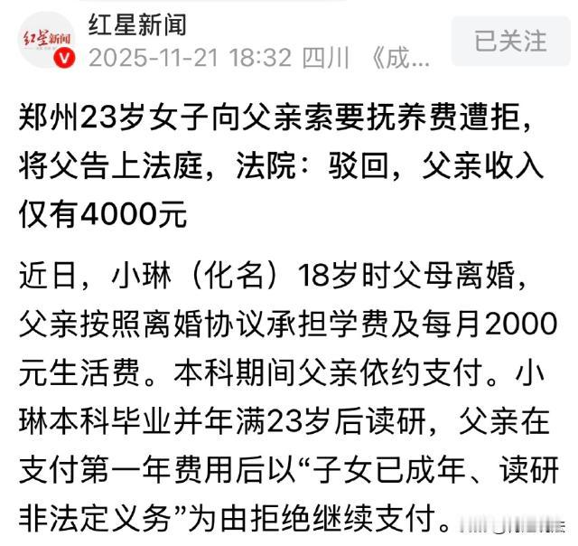 河南郑州,一姑娘18岁时,父母感情破裂离了婚,当时离婚协议里写得明明白白,姑娘跟母亲生活,父亲负责她的学费,每月还得给她2000块生活费。本科那4年,父亲没食言,学费按时给,生活费月月到账,姑娘没为钱的事操过心。姑娘本科毕业考上研究生,这年她23岁,头一年读研学费父亲给了,可第二年刚开学,父亲就不肯再掏钱,姑娘急了,协商不成起诉了父亲,最终法院这样判! 据悉,姑娘满心委屈,觉得协议里写好了父亲得管到毕业,自己现在读研也是为了以后能有更好的发展,父亲怎么能说不管就不管。 她觉得父亲月入4000,虽然不算多,但也不是完全负担不起,而且自己现在还在读书,没有经济来源,父亲有义务继续支付费用。 父亲有自己的苦衷,他说自己年纪大了,挣钱不容易,身体也不如从前,每个月4000的收入,要维持自己的生活开销,还要应对一些突发情况,实在没有多余的钱继续负担姑娘读研的费用。 而且,他认为姑娘已经成年,读研又不是义务教育,该自己养活自己了。 父亲到底有没有义务,继续支付姑娘读研的费用,姑娘的诉求合理吗? 根据《民法典》第一千零八十五条规定,离婚后,子女由一方直接抚养的,另一方应当负担部分或者全部抚养费。负担费用的多少和期限的长短,由双方协议;协议不成的,由人民 法 院 判决。前款规定的协议或者判决,不妨碍子女在必要时向父母任何一方提出超过协议或者判决原定数额的合理要求。 从这一条来看,关键就在于姑娘读研,是否属于父母需要继续负担抚养费的必要情形。 抚养费,一般是保障子女基本生活和教育的费用,这里的教育费用,通常是指义务教育或者高中阶段教育等基础性教育。 姑娘起诉时已经24岁,早过了法定抚养年龄。 按法律规定,父母抚养子女的义务一般到子女十八周岁为止,对于年满十八周岁但因残疾、疾病等原因丧失劳动能力,或者虽未完全丧失劳动能力,但其收入不足以维持生活的成年子女,父母仍需承担抚养义务。 姑娘的身体健康,具备劳动能力,不符合继续享受抚养费的条件。 父亲月入4000,持续负担研究生费用超出合理范围。 研究生教育费用相对较高,包括学费、住宿费、生活费等,对于月收入4000的父亲来说,长期负担确实会给他带来较大的经济压力。 而且父亲也有自己的生活需求,需要维持基本的生活水平,不能因为负担姑娘读研费用而使自己的生活陷入困境。 研究生教育是自主选择,不是保障基本生存的义务教育。 姑娘选择读研是为了提升自己的学历和知识水平,是为了将来能有更好的职业发展,这属于个人追求更高层次教育的自主行为。 父亲在姑娘本科期间按照协议履行了义务,已经尽到了自己的责任。 继续支付读研费用是道义上的帮助,而不是法律上的义务。 离婚协议里写了要管到毕业,这不算数吗? 离婚协议里关于抚养费的约定,是在当时的情况下双方达成的合意,但这个约定也要符合法律规定和实际情况。 随着子女年龄的增长和教育阶段的变化,原来的约定可能不再适用。 姑娘读研已经超出了父母法定抚养义务的范围,所以不能仅仅依据离婚协议就要求父亲继续支付费用。 如果父亲经济条件很好,是不是就应该继续支付呢? 即使父亲经济条件好,从法律角度来说,也没有必须支付成年子女读研费用的义务。 法律规定的抚养义务是有明确范围的,不能因为父母经济条件好就无限扩大这个范围。 当然,如果父母自愿支付,那是另外一回事,但这不是法律强制要求的。 综合以上分析,最终,法院驳回姑娘的请求。 父母对子女的爱是无私的,但在法律和现实面前,也要明确各自的权利和义务。 子女在成年后,应该学会独立,通过自己的努力去追求梦想,而不是过度依赖父母。 父母在履行抚养义务的同时,也要考虑自己的实际情况,不能超出自己的能力范围。