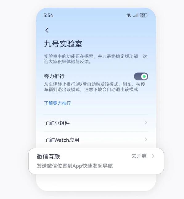 怎么样把微信上收到的地址投屏到九号电动车的仪表盘进行导航? 今天发现一个实用的功能,朋友通过微信把地址定位发送给我们,可以直接投屏到九号电动车上进行导航,可以不用手机了。 只需要打开九号出行app,接着点击设备页面,然后依次点更多功能---实验室,在打开的页面中选择开启微信互联功能。 接下来在微信中打开目标地址,点击打开方式的按钮,接着选择发送到九号出行app,然后选择我的设备中的电动车型号,这个时候电动车就会提示发起导航,不需要手机也可以导航。