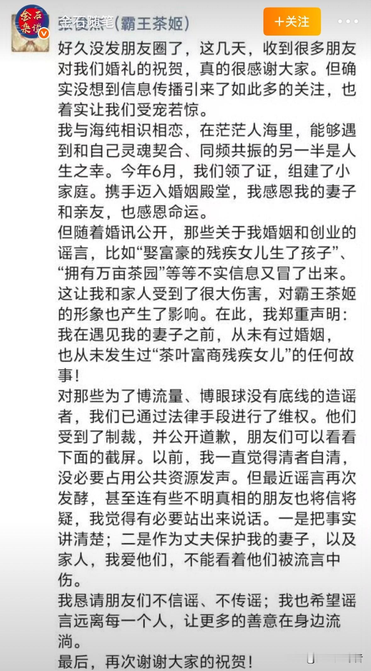 近日,网上传得沸沸扬扬,霸王茶姬创始人张俊杰靠迎娶富商残疾女儿发家,如今事业有成,又传出要与天合光能联席董事长高海纯结婚的消息。面对网络舆论的聚焦,霸王茶姬创始人张俊杰在朋友圈作出澄清,表示自己与妻子张海纯是初婚,网上有关他创业和婚姻的说法均为谣言。