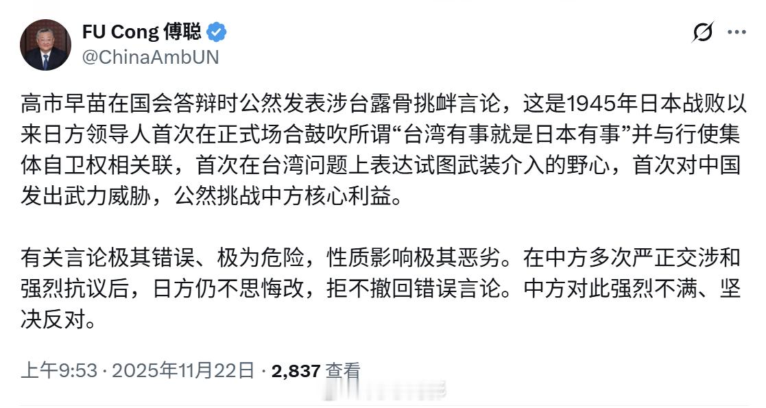 中国常驻联合国代表傅聪贴出了致函联合国秘书长古特雷斯的全文,该函将作为联合国大会正式文件,向全体会员国散发。几天看到我们不依不饶,而且进一步在国际上把这事情闹大,其实就是在做一个国际舆论铺垫,未来梧桐台湾省时,日本胆敢轻举妄动,别怪我们没打招呼。