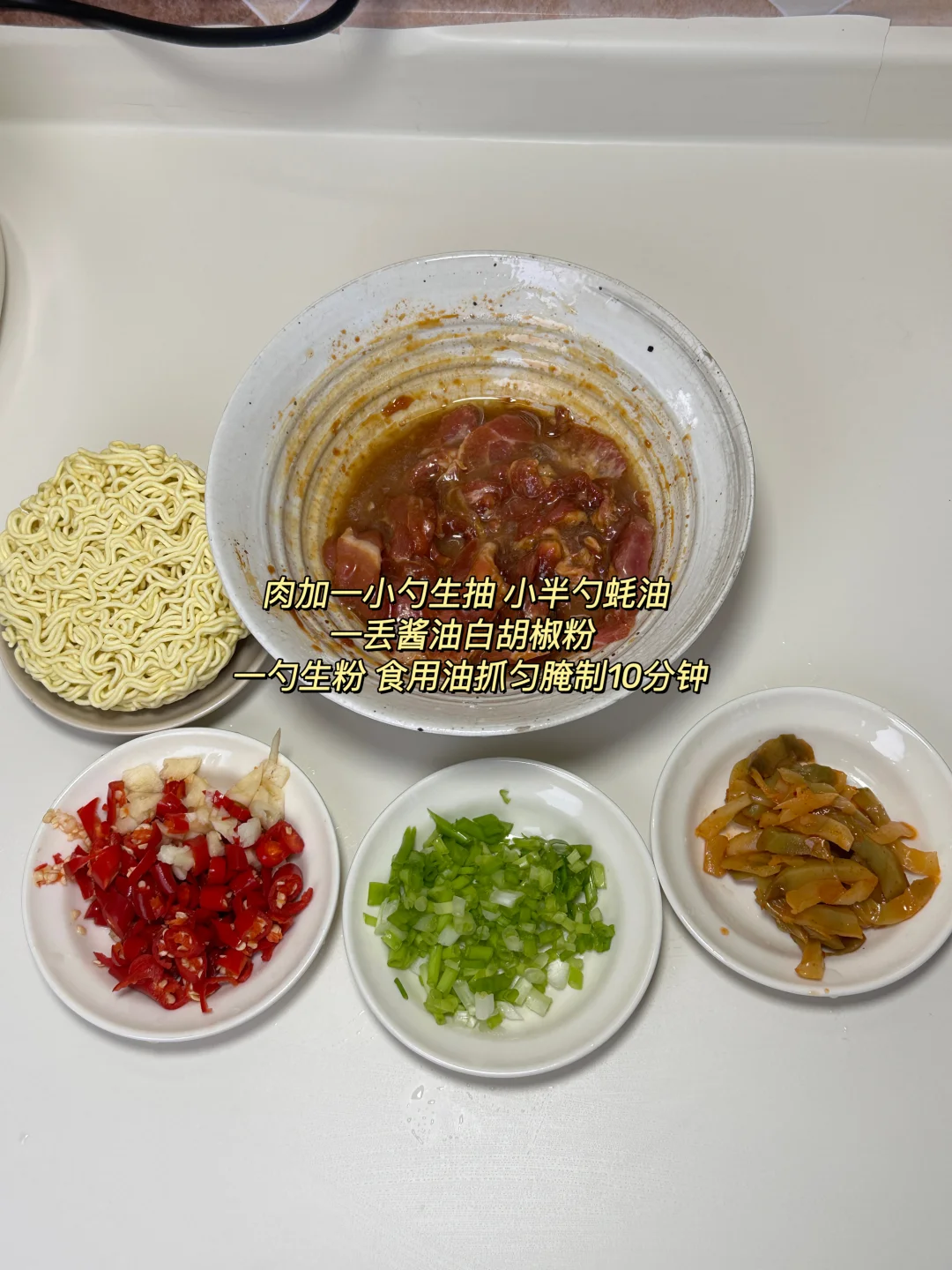 榨菜肉丝面🍜 鲜辣入味,面条吸满了汤汁 大口嗦面 再喝口汤好幸福☺️ ✨食材:猪肉 榨菜 蒜 小米椒 辣椒粉 泡面 1️⃣:猪肉切薄片再切小加一小勺生抽 小半勺蚝油 一点酱油,白胡椒粉 生粉 食用油抓匀腌制一会。 2️⃣:锅里倒油烧热 放猪肉炒变色推一边 下蒜 小米椒辣椒粉中火炒香,倒入榨菜炒几下 加大概400毫升的水,加半铲生抽 小半勺蚝油 一丢酱油煮开。 放面煮熟 起锅前加一丢鸡精 一把葱花调味增香。 猪肉推荐梅花肉,前腿肉~ 榨菜有咸味就没有额外加盐。根据个人口味哈 好好吃饭呀🖖🏻